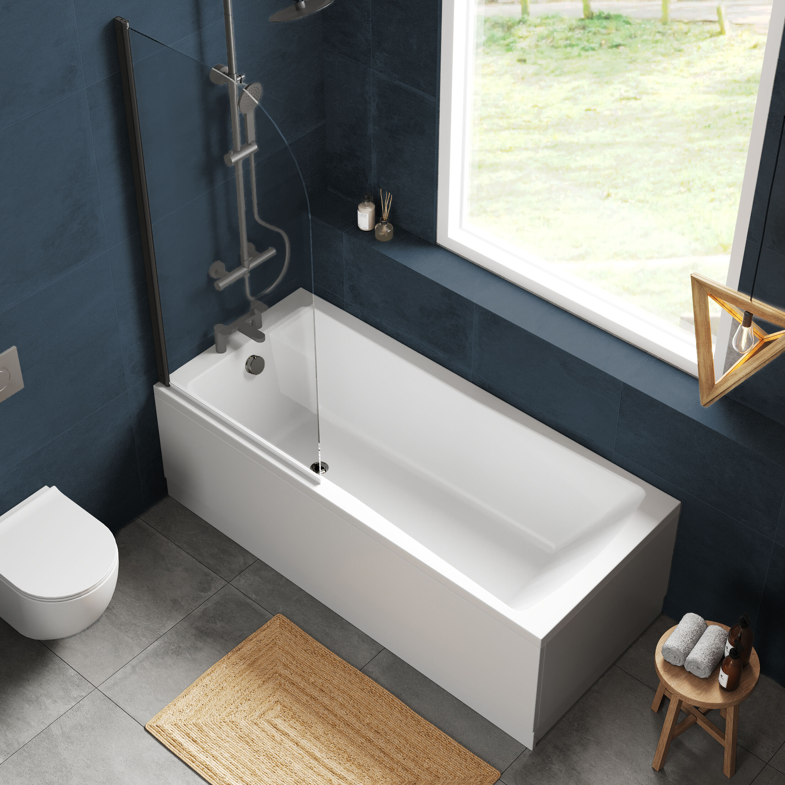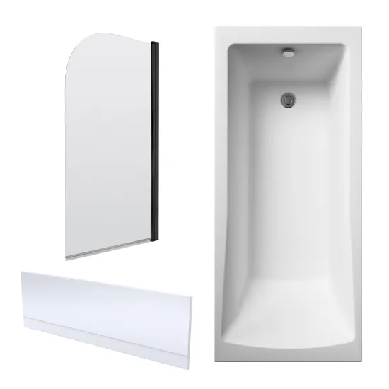 Square single ended bath, bath screen & gloss white acrylic side panel