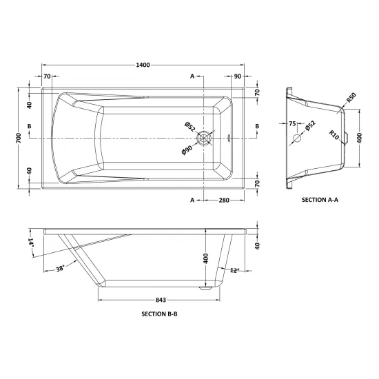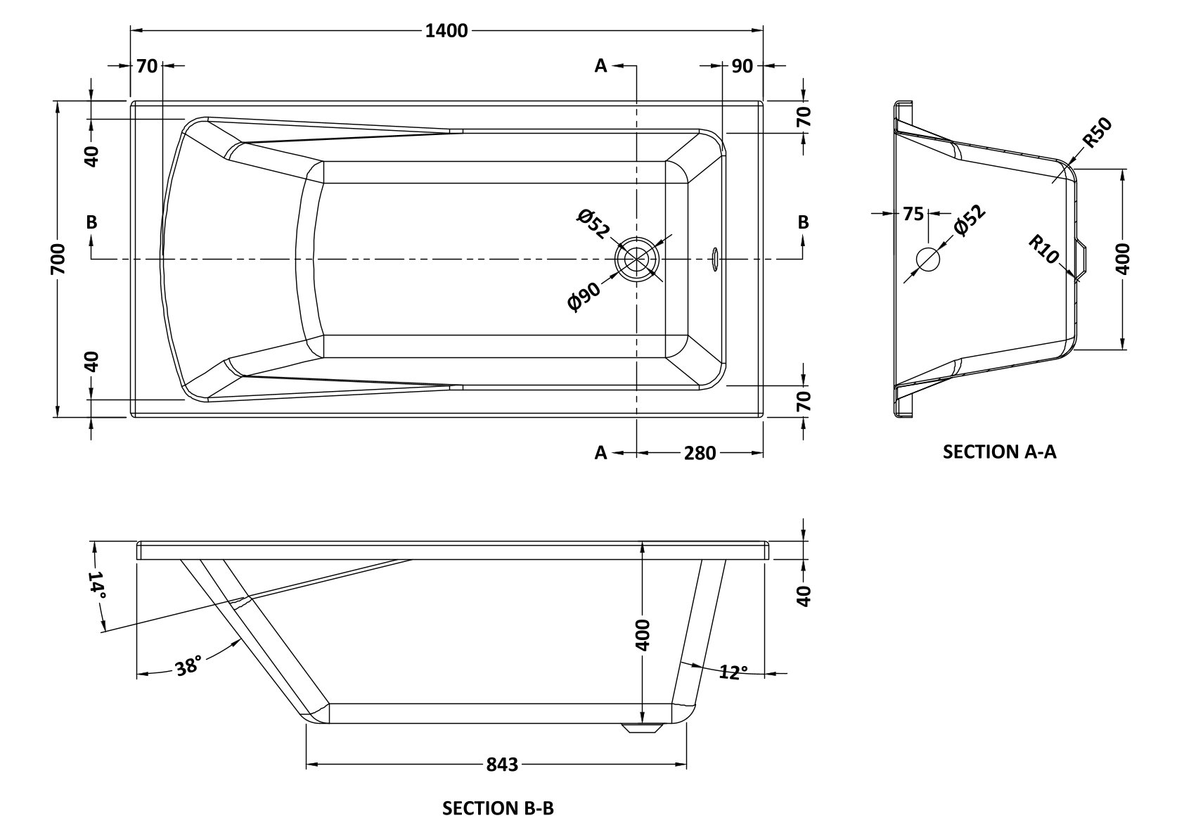 nuie Linton Square Single Ended Bath 1400 x 700mm