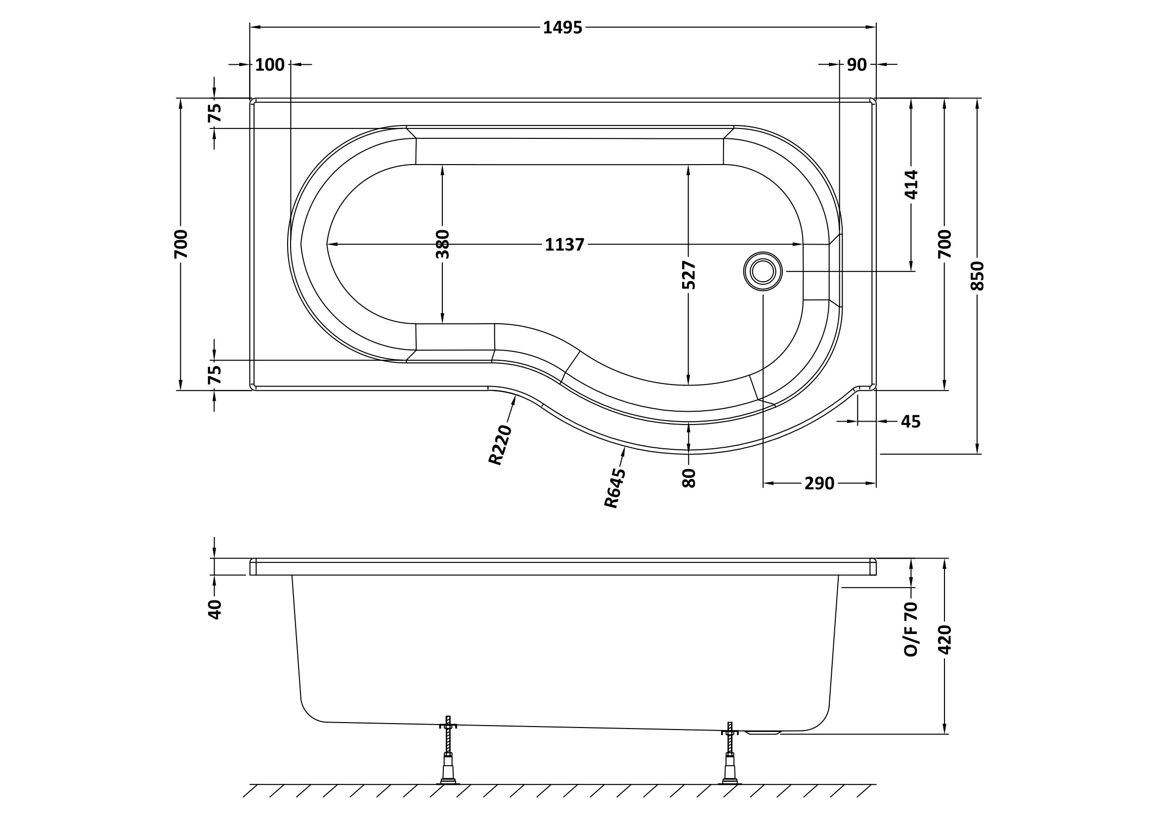 P Shaped shower whirlpool bath designed and built to the highest quality