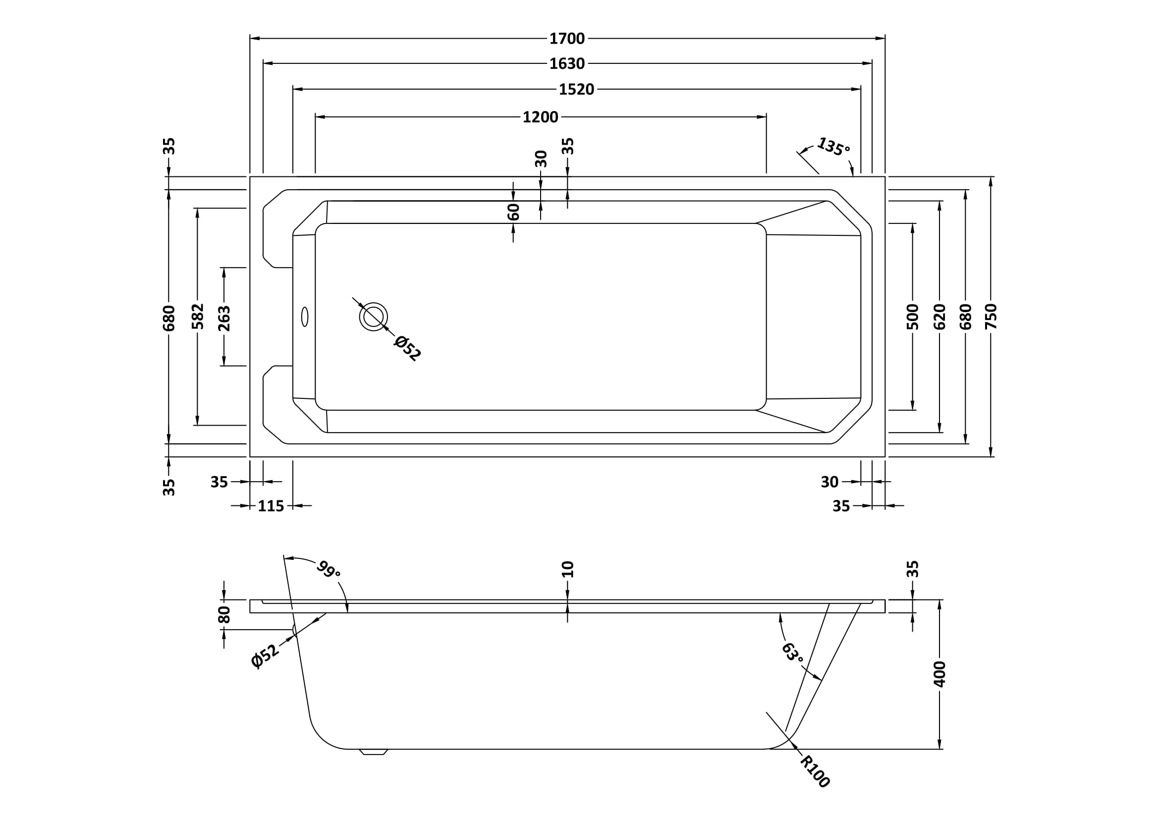 1700mm x 750mm Art Deco 6 Jet Whirlpool Bath - White