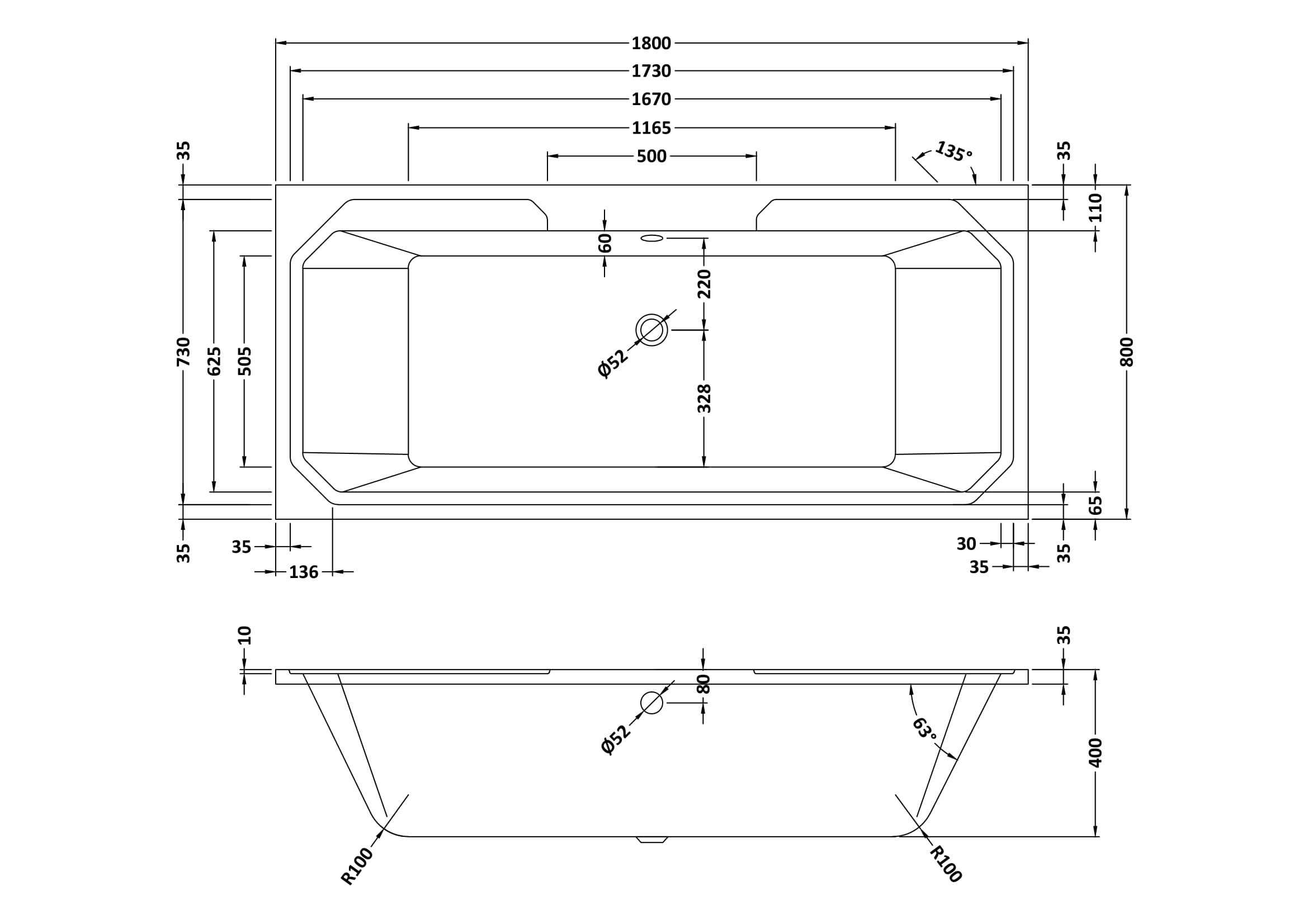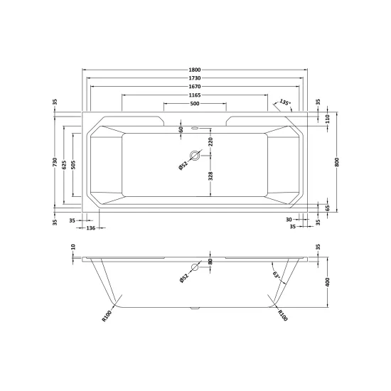 1800mm x 800mm Art Deco Double Ended 12 Jet Whirlpool Bath - Chrome
