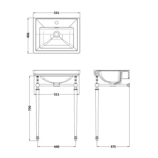 Nuie 530mm Traditional 3 Tap Hole Basin with Stand