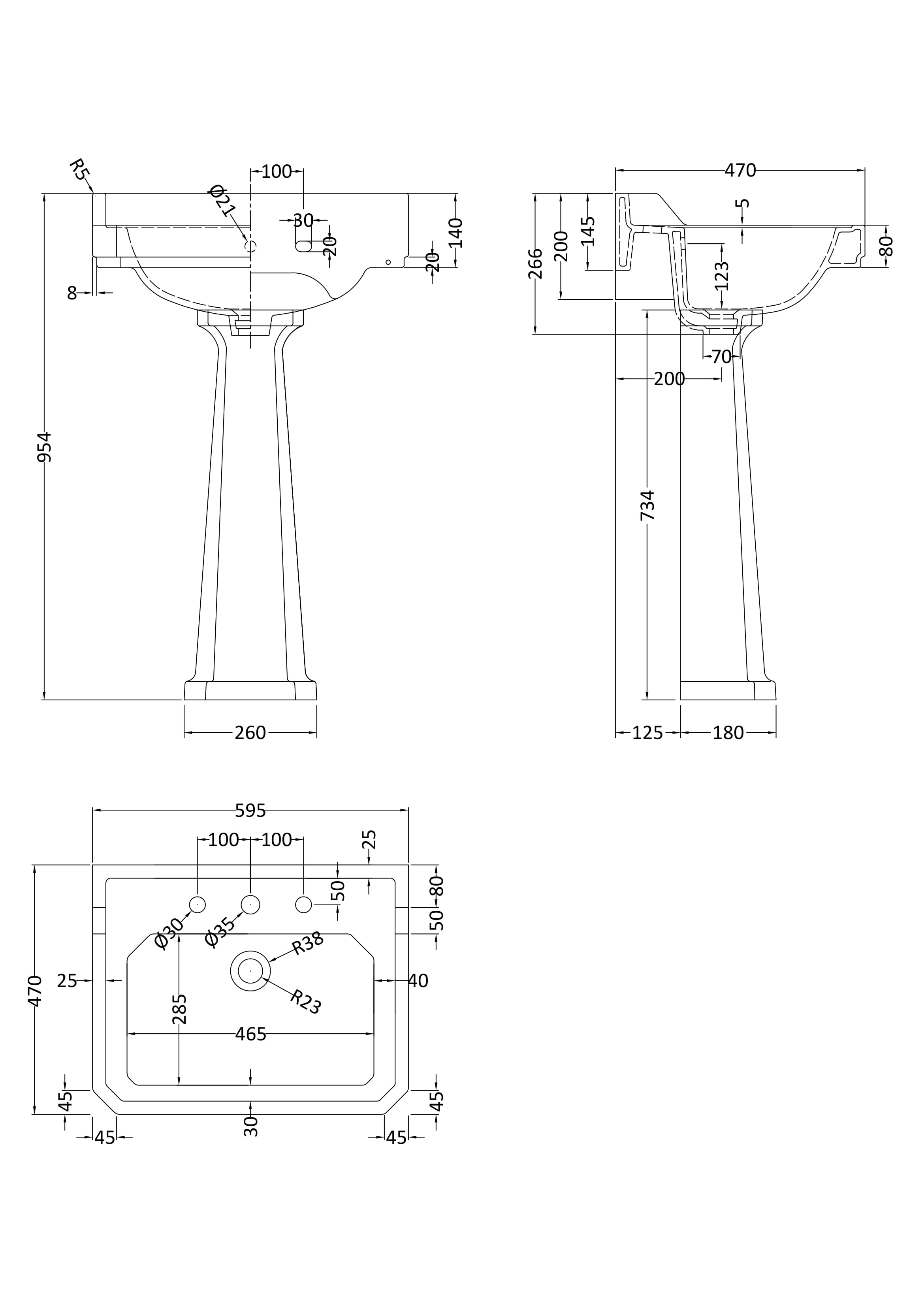 Fitzroy 595mm Basin 3TH,Including Comfort Height Pedestal