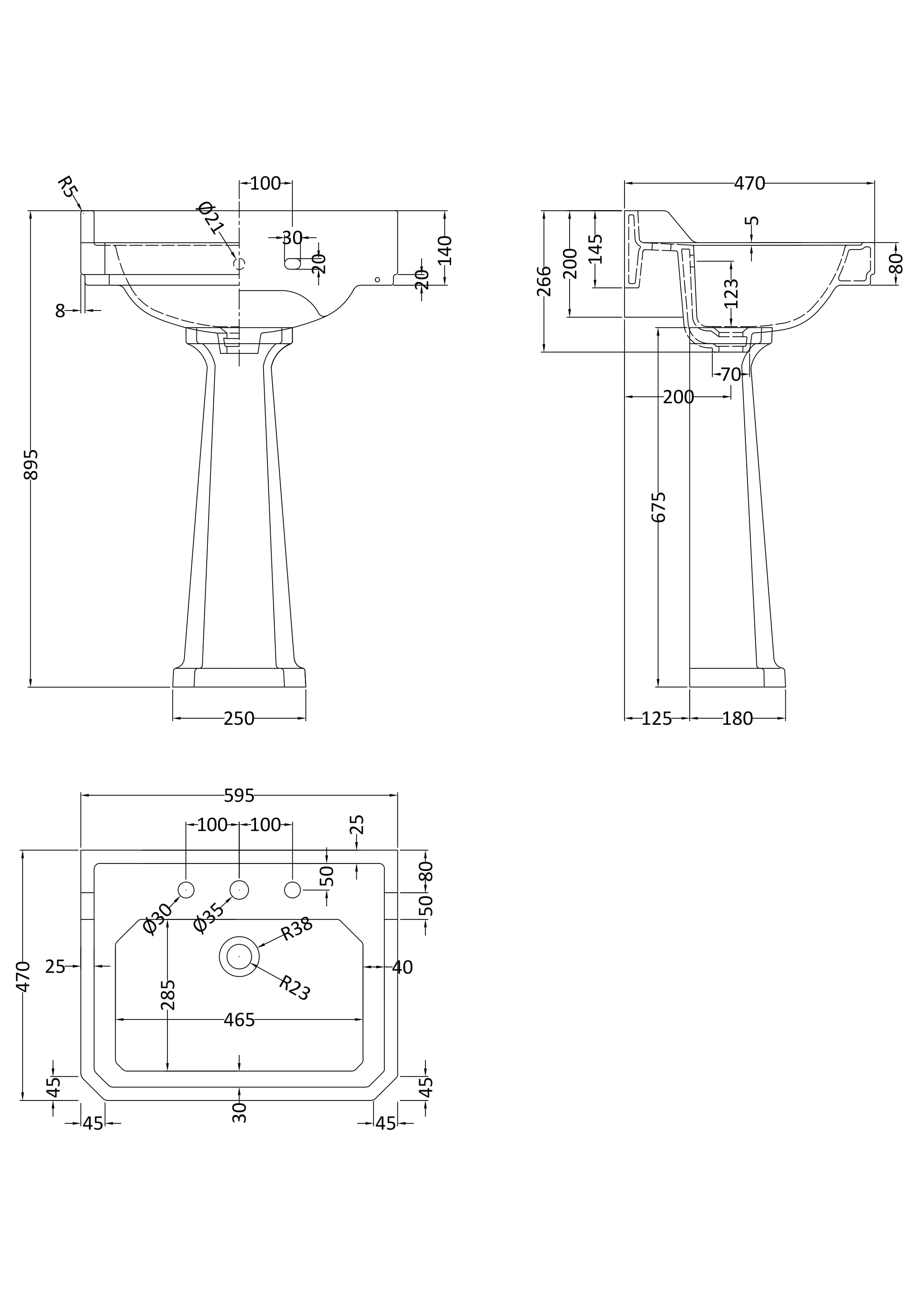 Fitzroy 595mm Basin 3TH,Including Pedestal