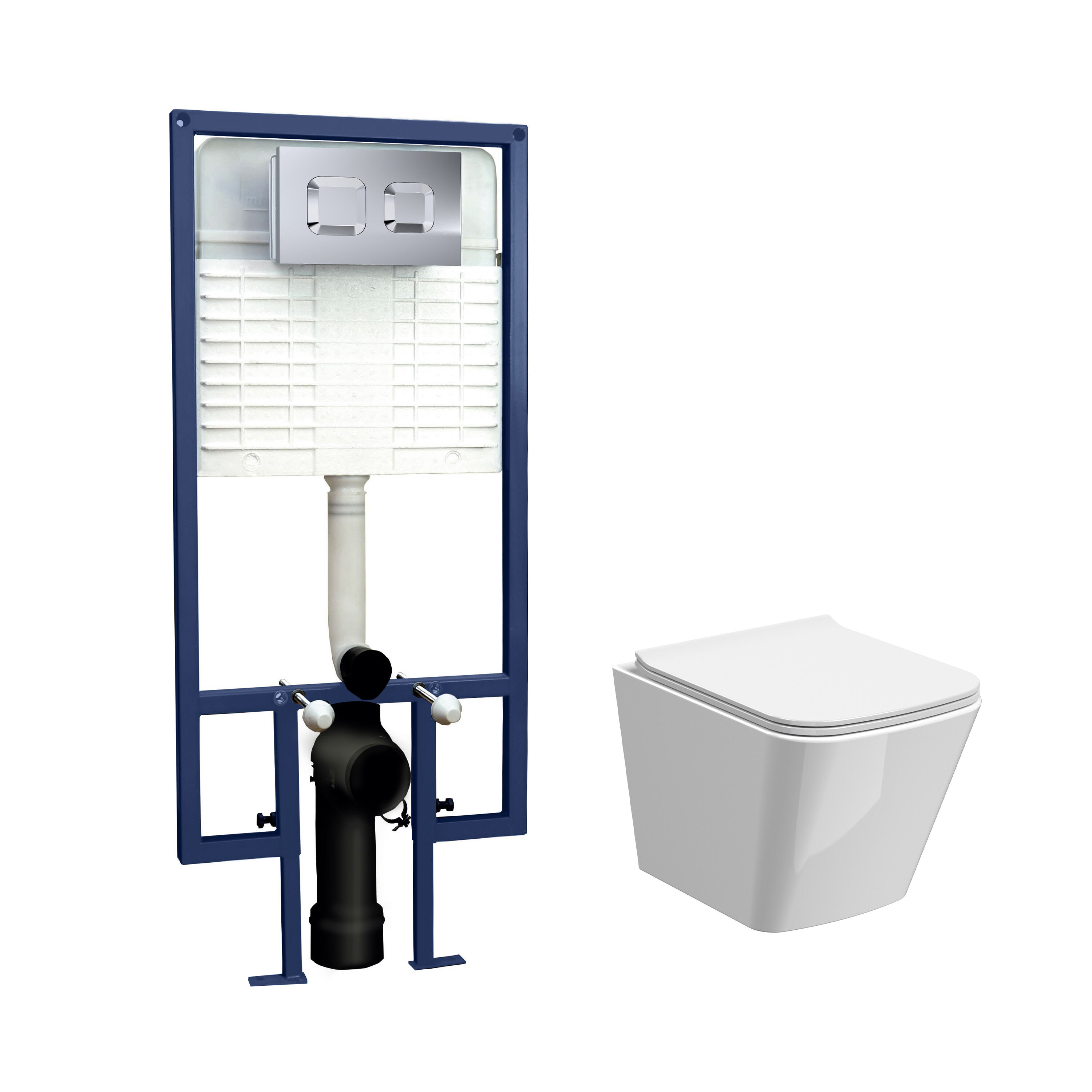 Vitreous china pan in crisp white for durability and easy cleaning.Stainless steel concealed cistern for long-lasting performance.Polished chrome flush plate for a premium, modern look.Includes soft-close seat for quiet, comfortable use.Wall-hung design helps create a minimalist, easy-to-clean bathroom layout.Supplied as a complete 5-in-1 set for a streamlined installation.Backed by a 5-year guarantee.
