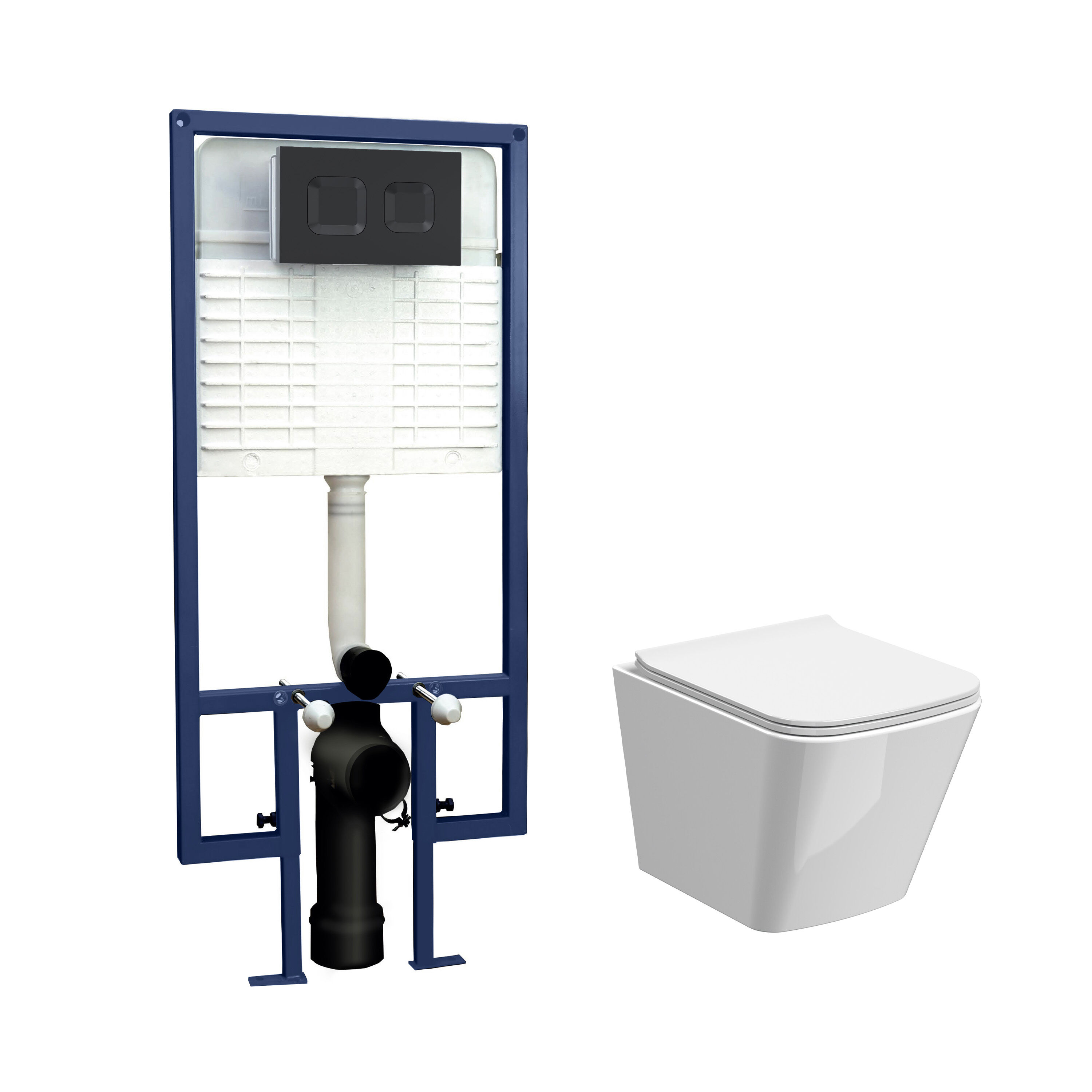 Vitreous china pan in crisp white for durability and easy cleaning.Stainless steel concealed cistern for long-lasting performance.Matt Black flush plate for a premium, modern look.Includes soft-close seat for quiet, comfortable use.Wall-hung design helps create a minimalist, easy-to-clean bathroom layout.Supplied as a complete 5-in-1 set for a streamlined installation.Backed by a 5-year guarantee.
