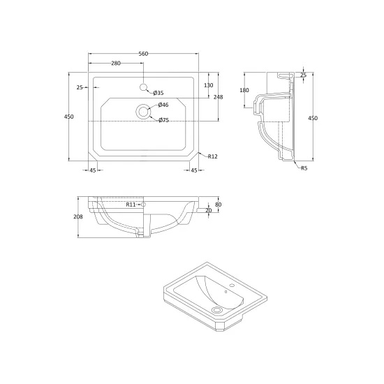 Bayswater 560mm 1 Tap Hole Semi-recessed Basin