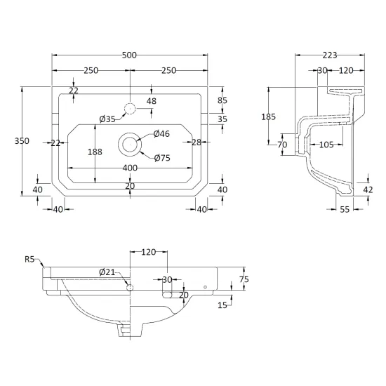 Fitzroy 500mm Basin 1 Tap Hole, Excluding Pedestal