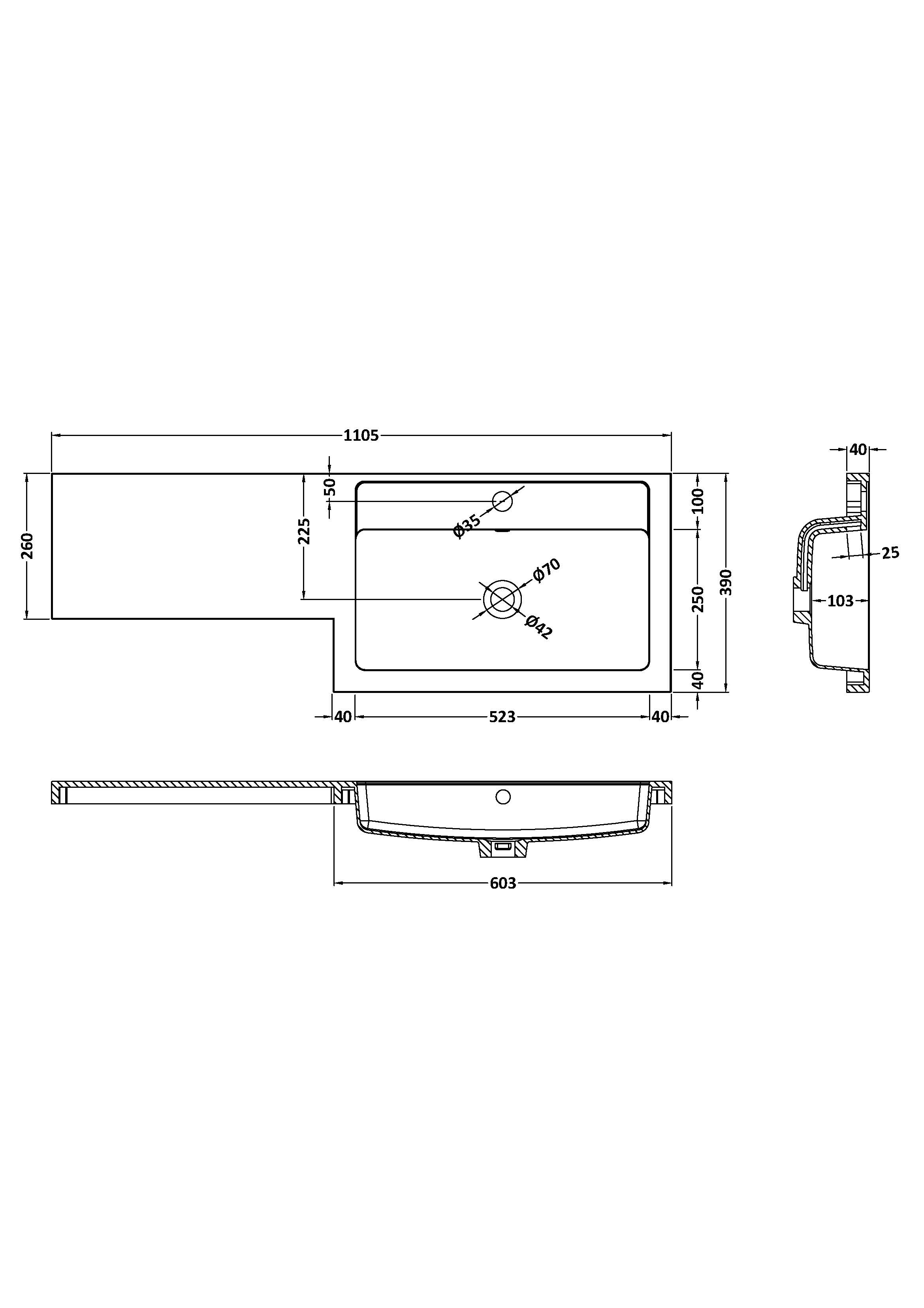1100x390 L Shaped Polymarble Basin - Right Hand