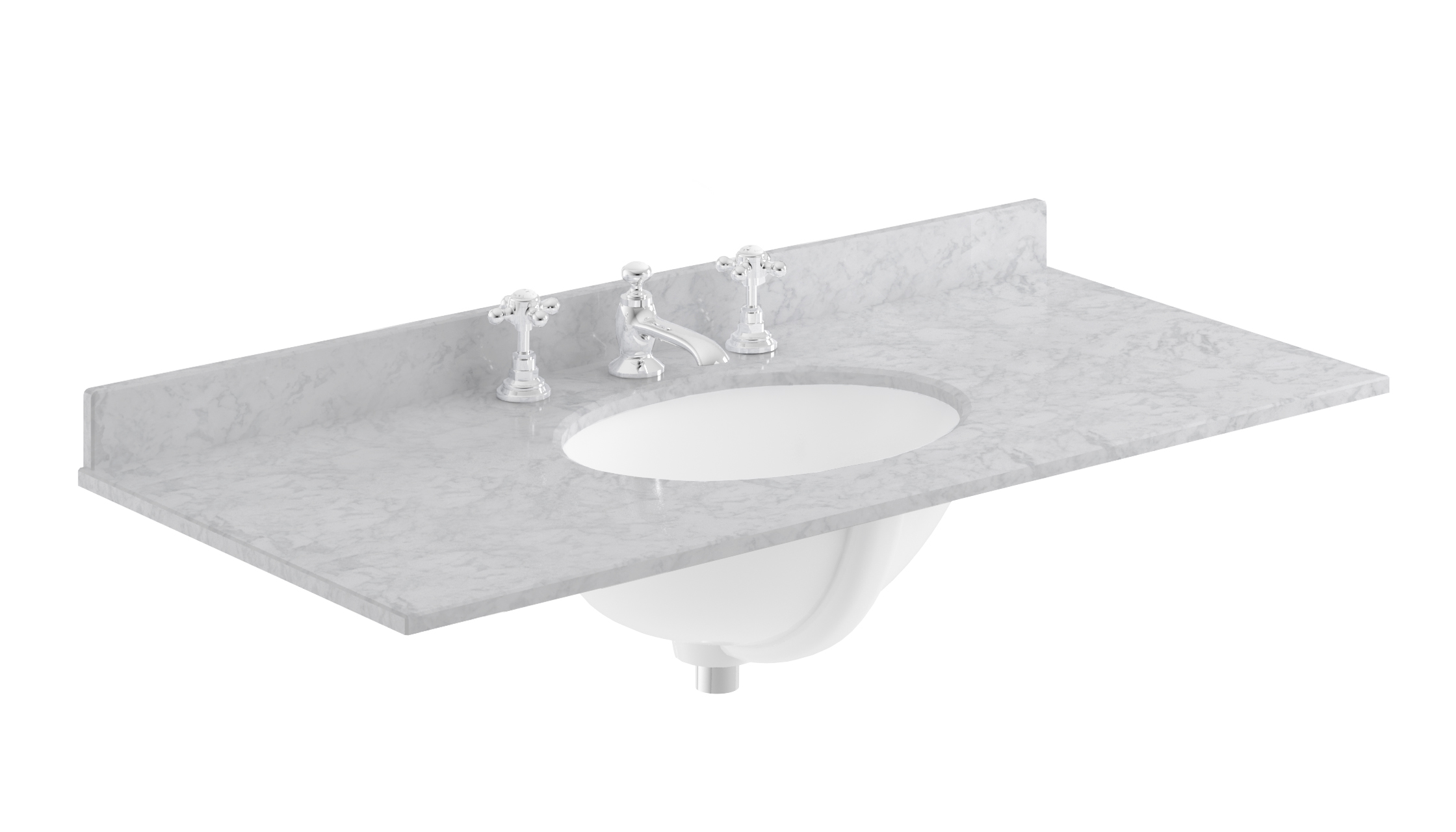 This unique grey marble top creates a subtle contrast against the classic white china basin.