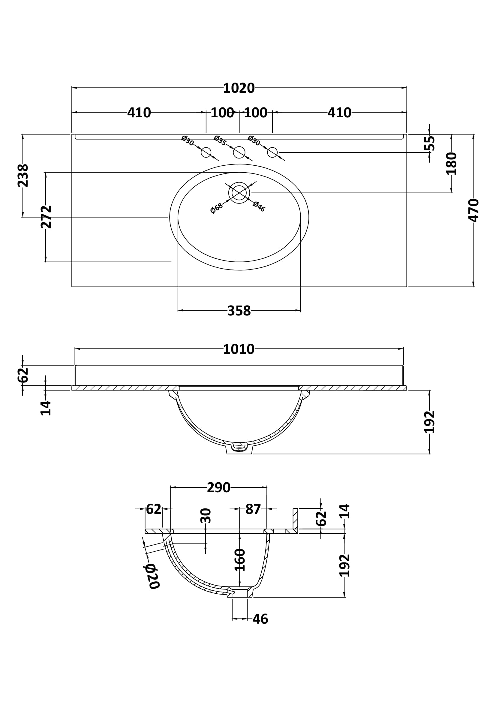 Bayswater 1000mm Single Bowl 3 Tap Holes
