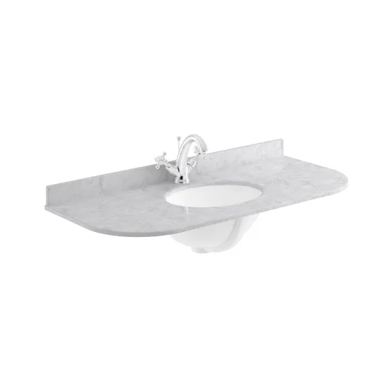 This unique grey marble top creates a subtle contrast against the classic white china basin.