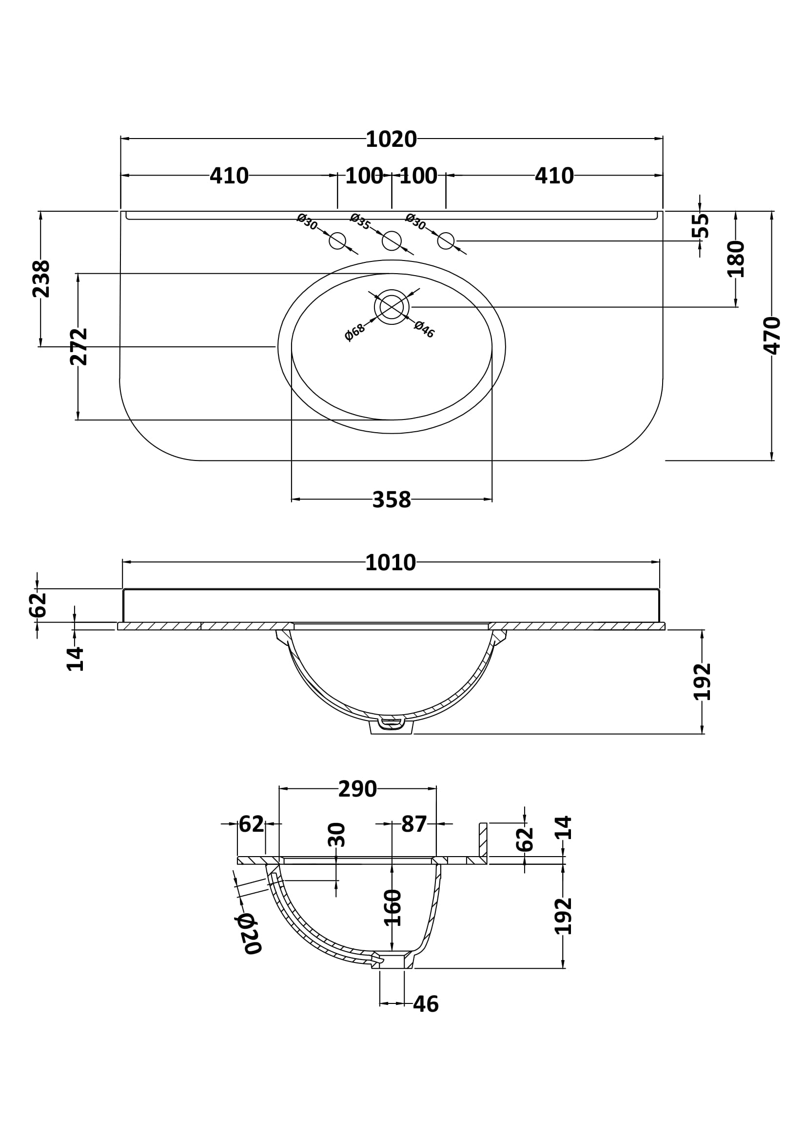 Bayswater 1000mm Single Bowl with Radius 3 Tap Holes