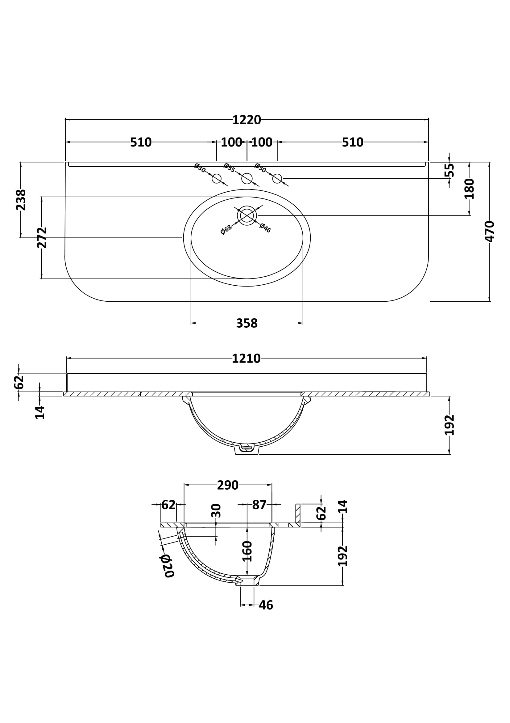 Bayswater 1200mm Single Bowl with Radius 3 Tap Holes