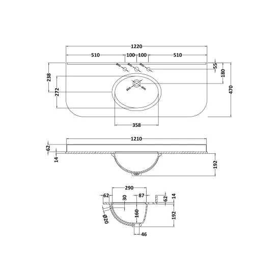 Bayswater 1200mm Single Bowl with Radius 3 Tap Holes