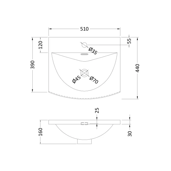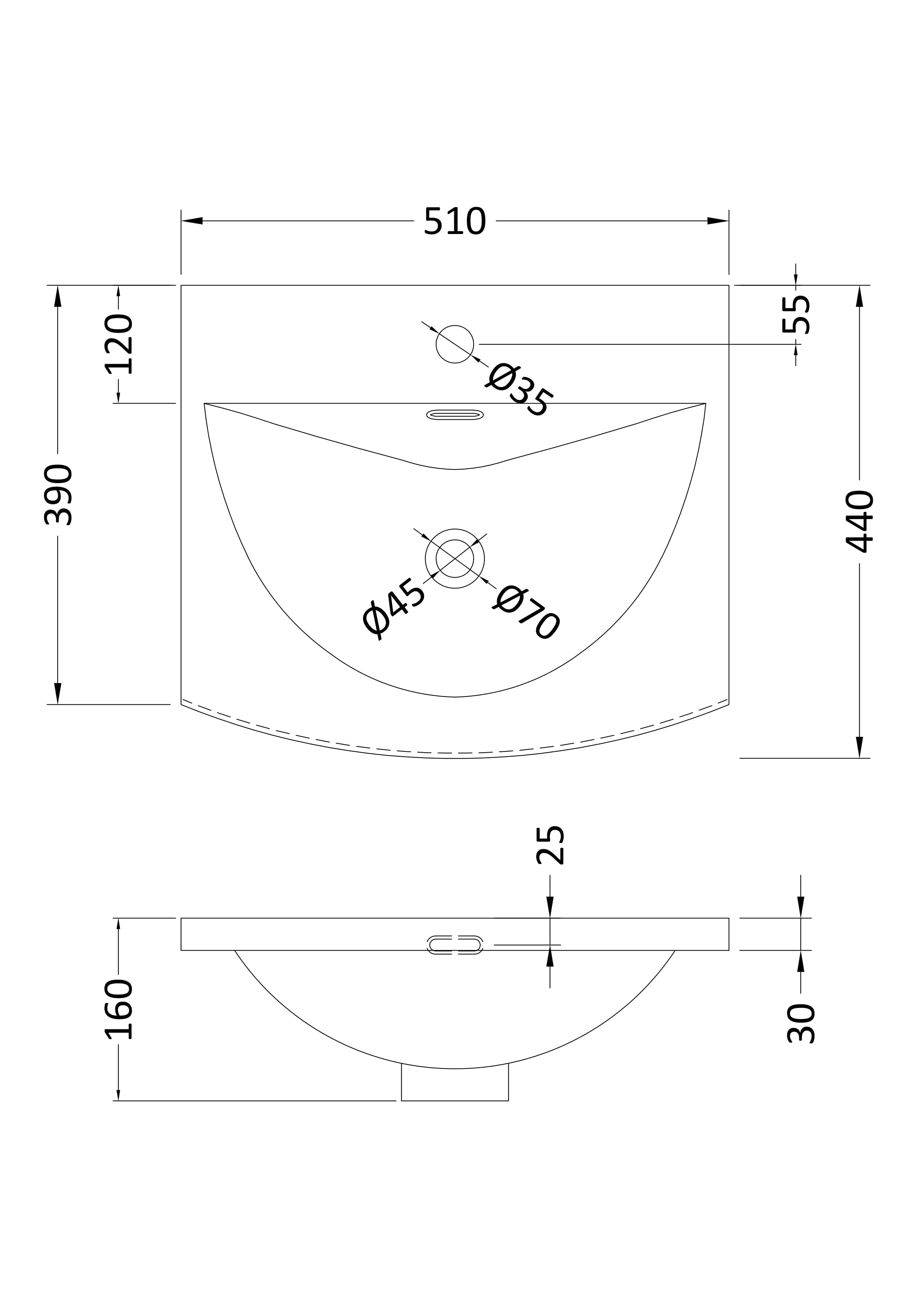 Synergy Omerg 500mm Curved Basin- 1 Tap Hole - White