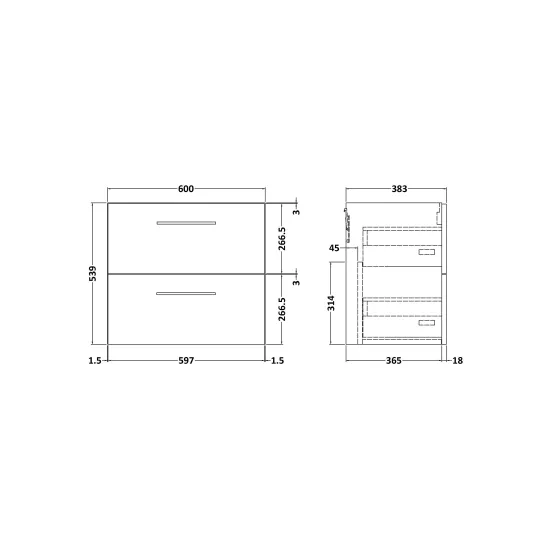 600mm Wall Hung 2 Drawer Unit (365 Deep)