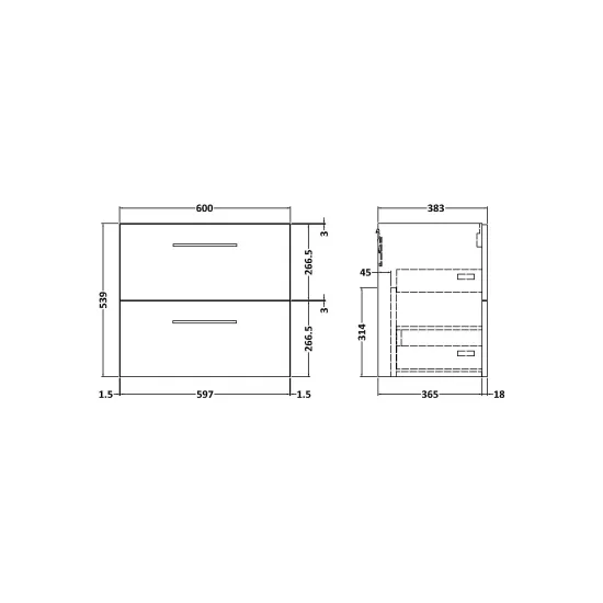 nuie Arno 600mm Wall Hung 2-Drawer Unit - Solace Oak