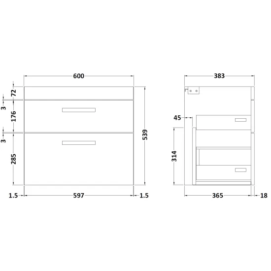 Athena Wall Hung 2 Drawer Vanity Unit 600mm