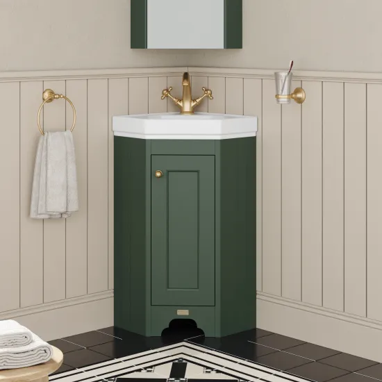 This striking green cabinet creates a unique centre piece to any classic themed bathroom.