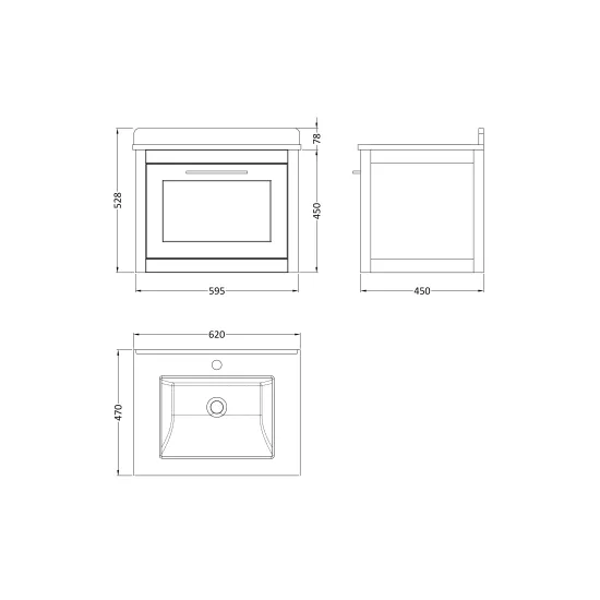 BC Designs Crestfield 600mm Wall Hung 1-Drawer Unit & 1 Bowl Marble Top - Earl's Grey