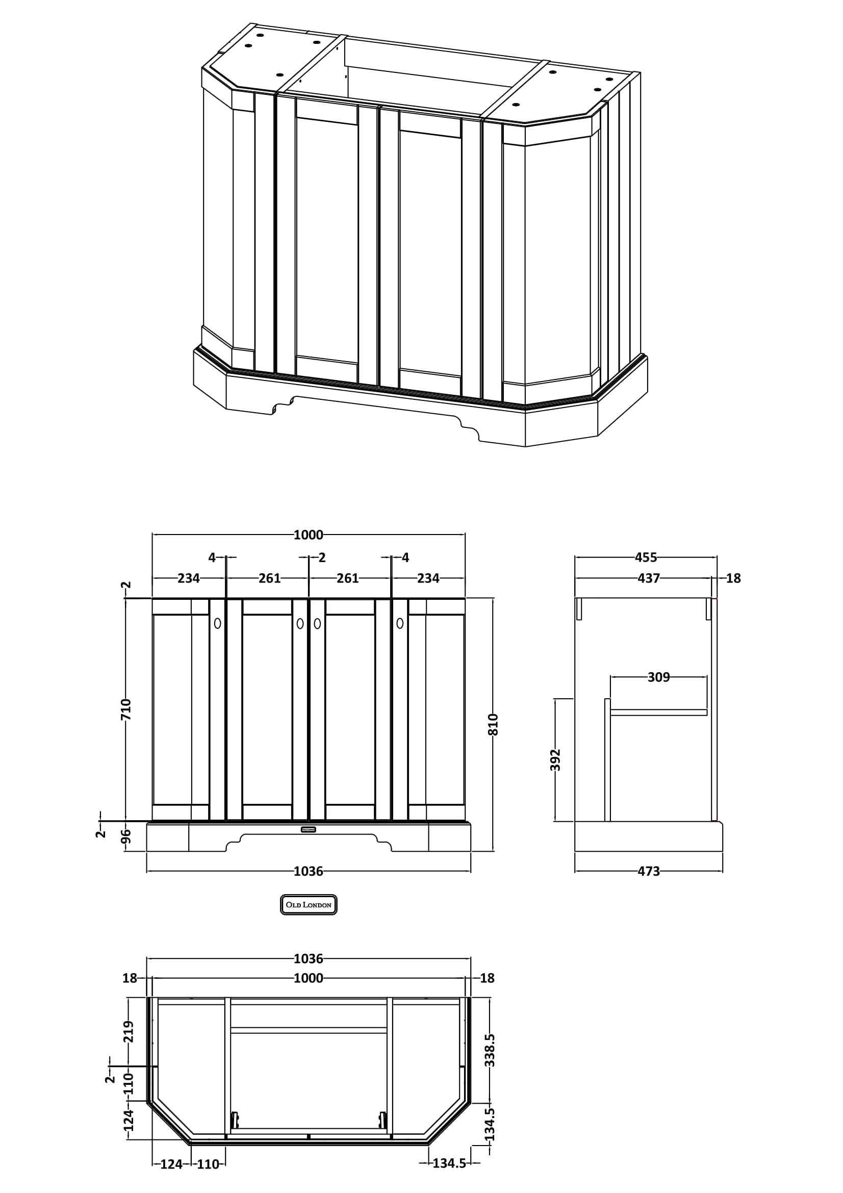 Old London Floor Standing Angled 4 Door Basin Unit 1000mm - Storm Grey