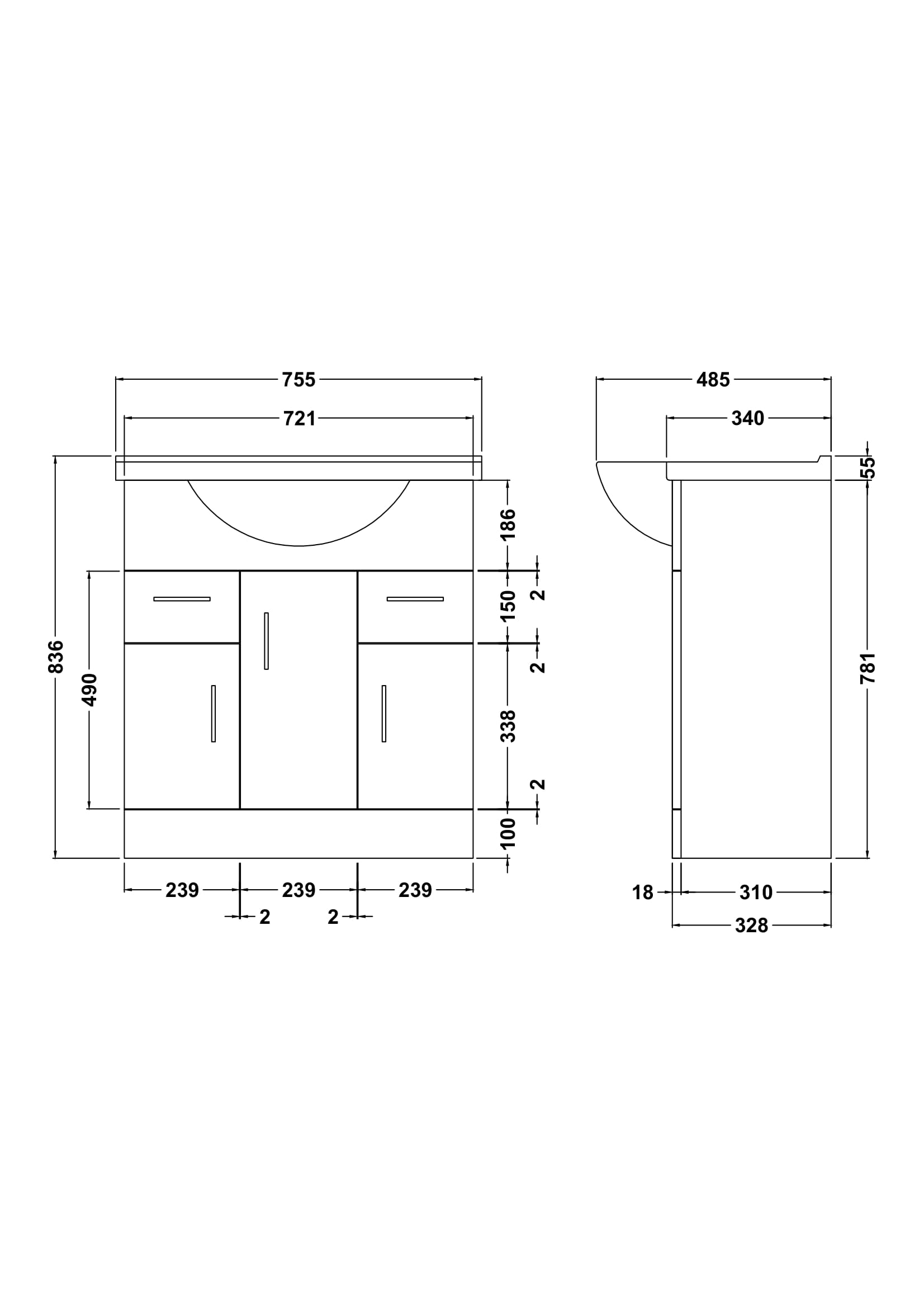 Mayford Floor Standing 3 Door 2 Drawer Vanity Unit 750mm