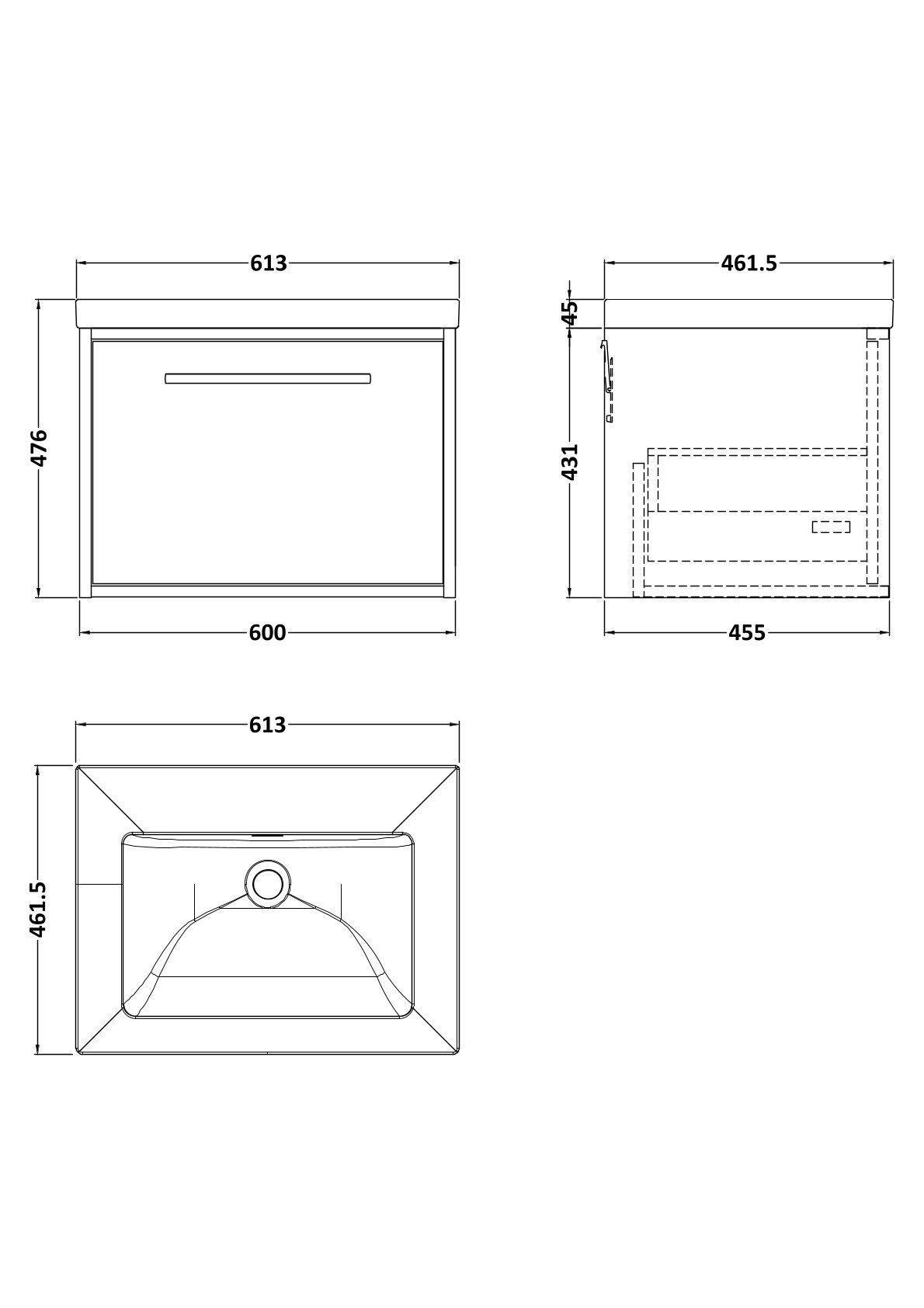 BC Designs Roseburn 600mm Wall Hung 1 Drawer Unit and 0 Tap Hole Contemporary Basin - Metallic Slate