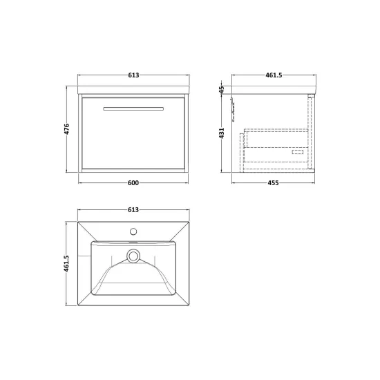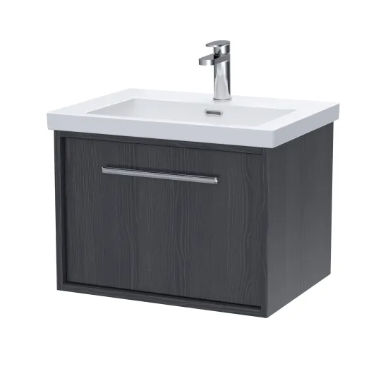 nuie Lux Roseburn 600mm Wall Hung 1 Drawer Unit and 1 Tap Hole Contemporary Basin - Graphite Grey Woodgrain