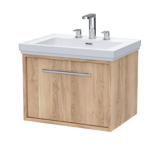 nuie Lux Roseburn 600mm Wall Hung 1 Drawer Unit and 3 Tap Hole Classic Basin - Bleached Oak