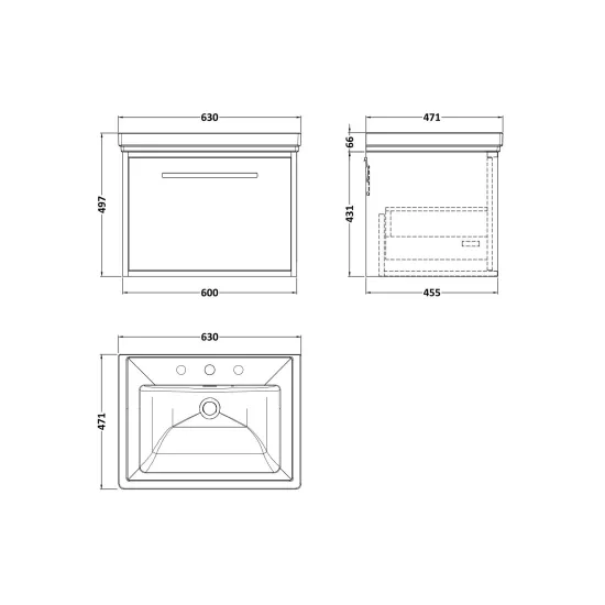 BC Designs Roseburn 600mm Wall Hung 1 Drawer Unit and 3 Tap Hole Classic Basin - Metallic Slate