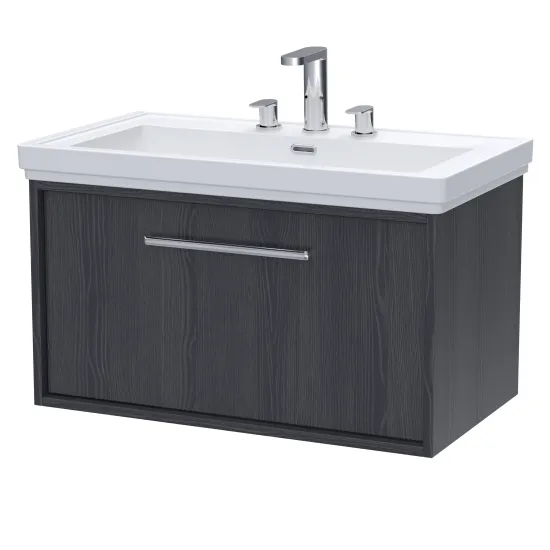 nuie Lux Roseburn 800mm Wall Hung 1 Drawer Unit and 3 Tap Hole Classic Basin - Graphite Grey Woodgrain