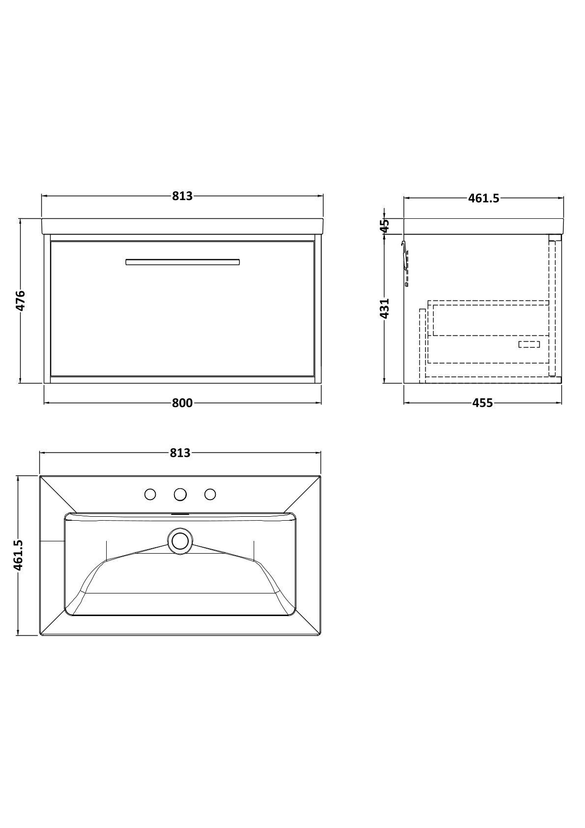 nuie Lux Roseburn 800mm Wall Hung 1 Drawer Unit and 3 Tap Hole Contemporary Basin - Autumn Oak