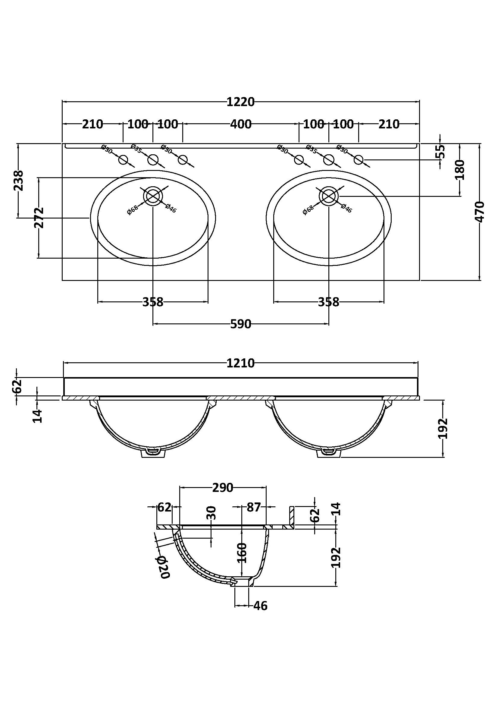 Double Bowl Marble Top 3 Tap Hole 1220mm