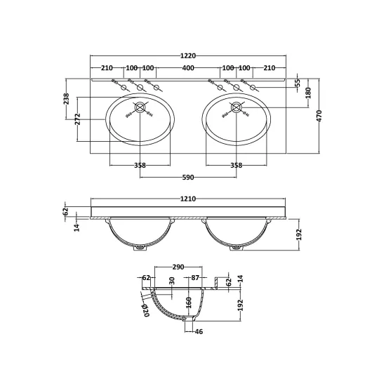 Double Bowl Marble Top 3 Tap Hole 1220mm