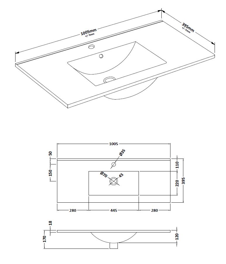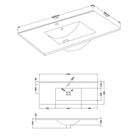Furniture Minimalist Slimline Ceramic Basin 1 Tap Hole 1000mm