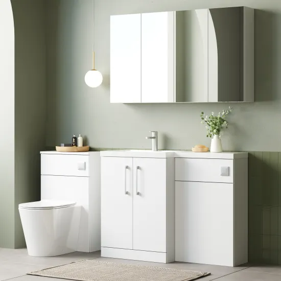 Contemporary floor standing design provides ample storage for all your bathroom toiletries and cleaning supplies