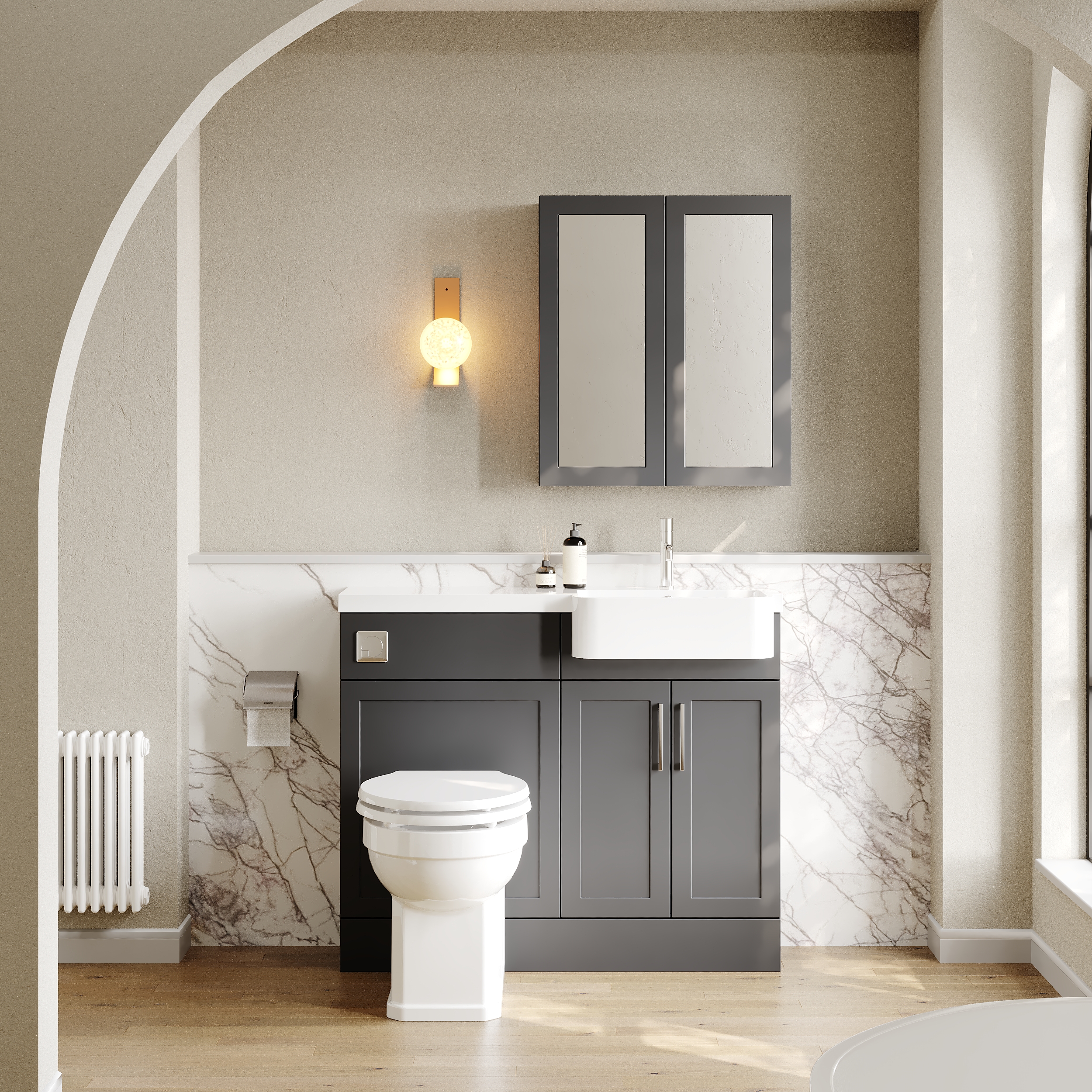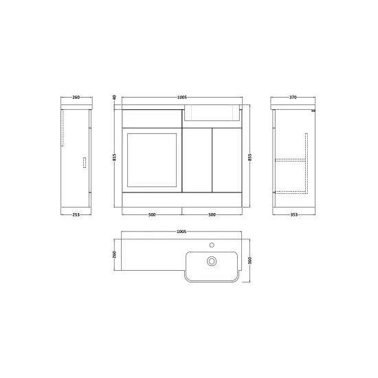 Supplied with luxury polymarble right-hand basin, predrilled with 1 tap hole and high quality handles.