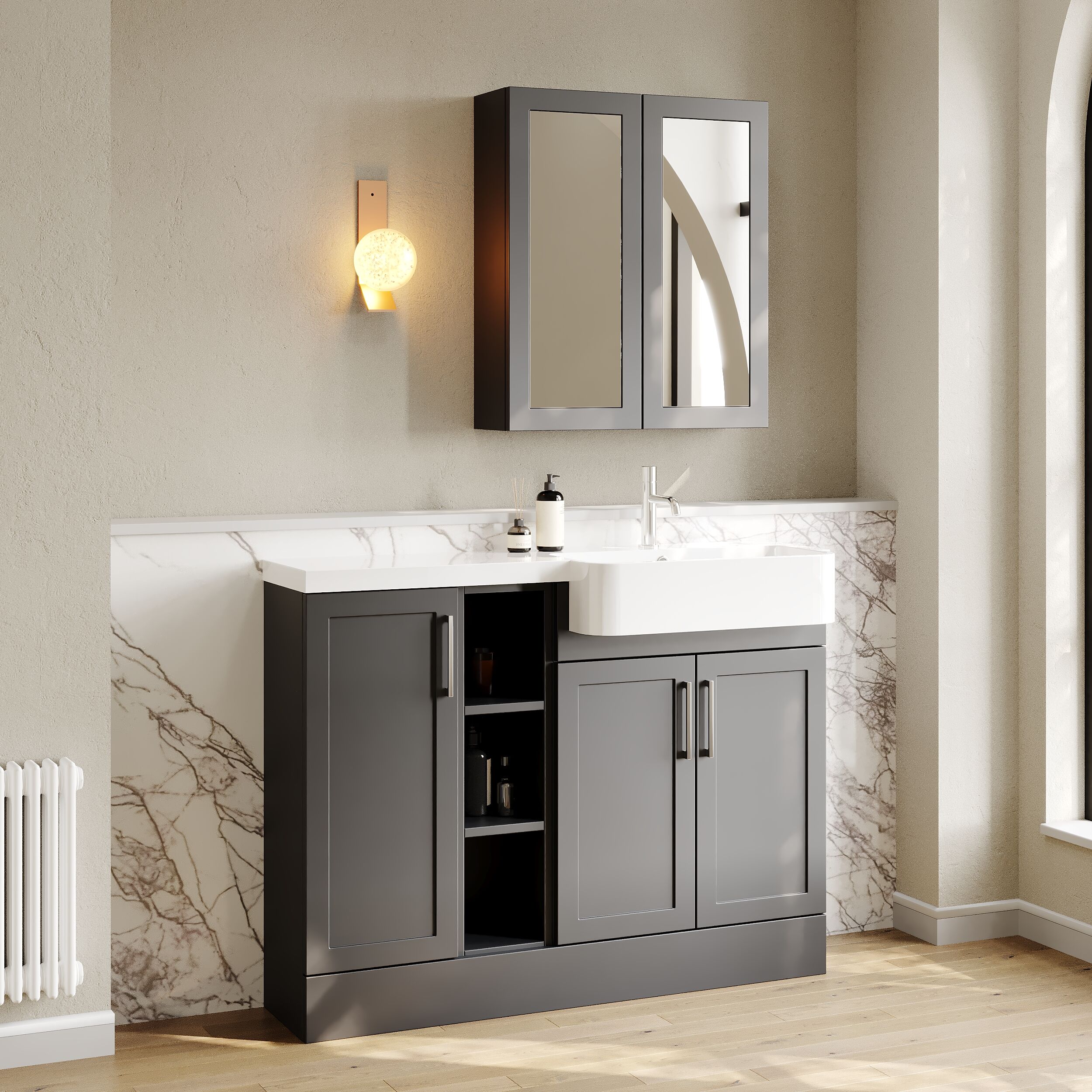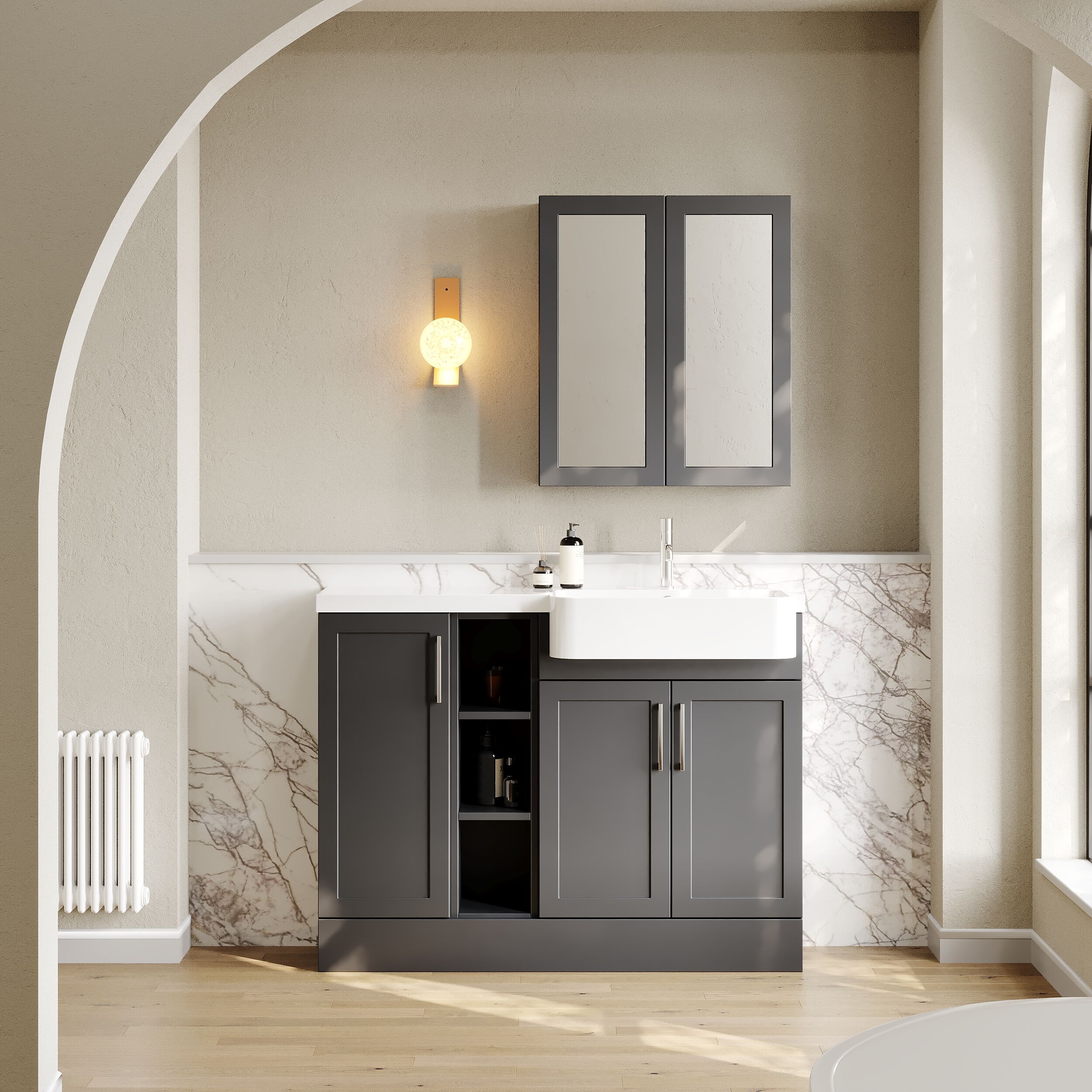 Supplied with luxury polymarble right-hand basin, predrilled with 1 tap hole and high quality handles.