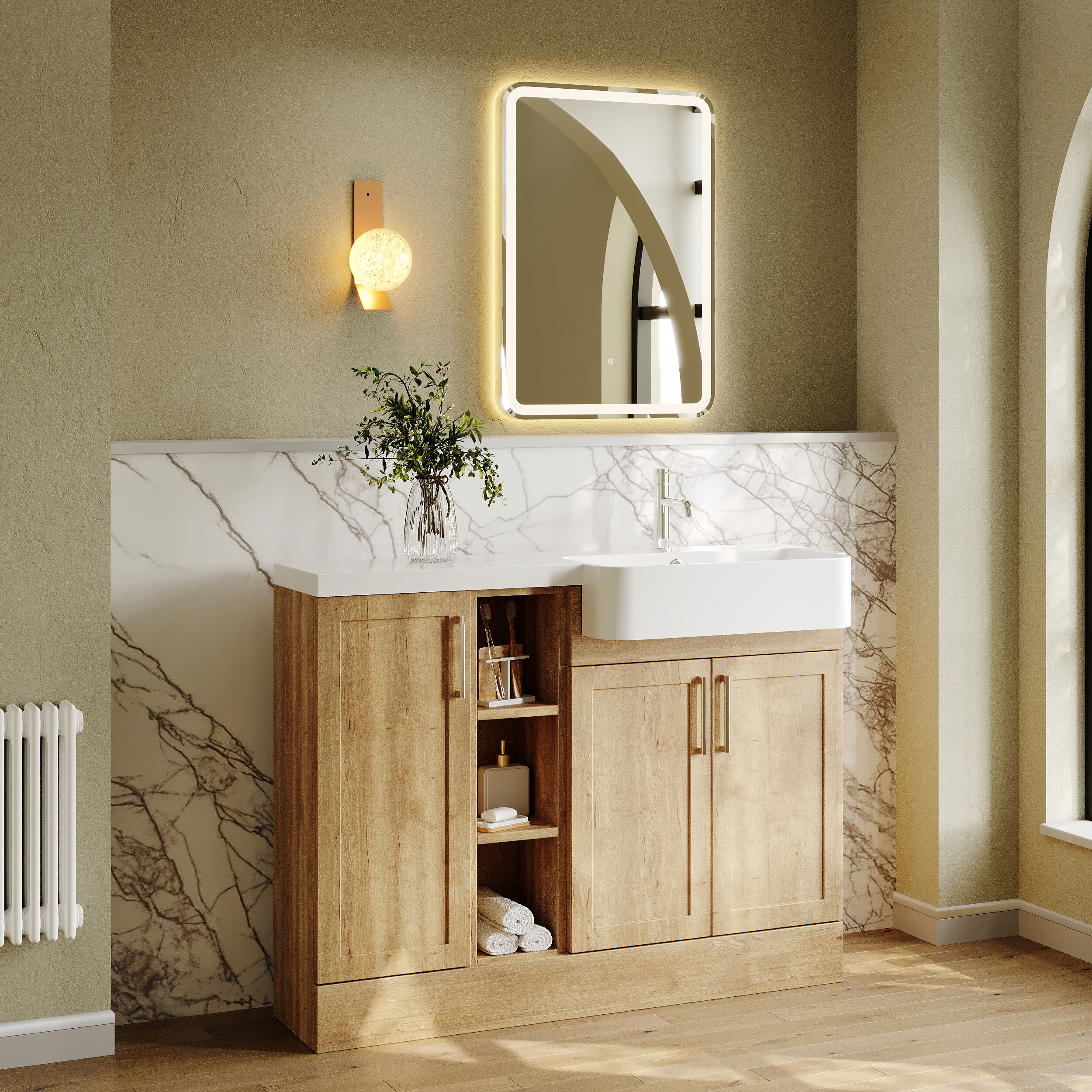 Nuie Lux Fable 1100mm Autumn Oak Right Hand Combination Unit & Basin With Soft Close Doors & Handles