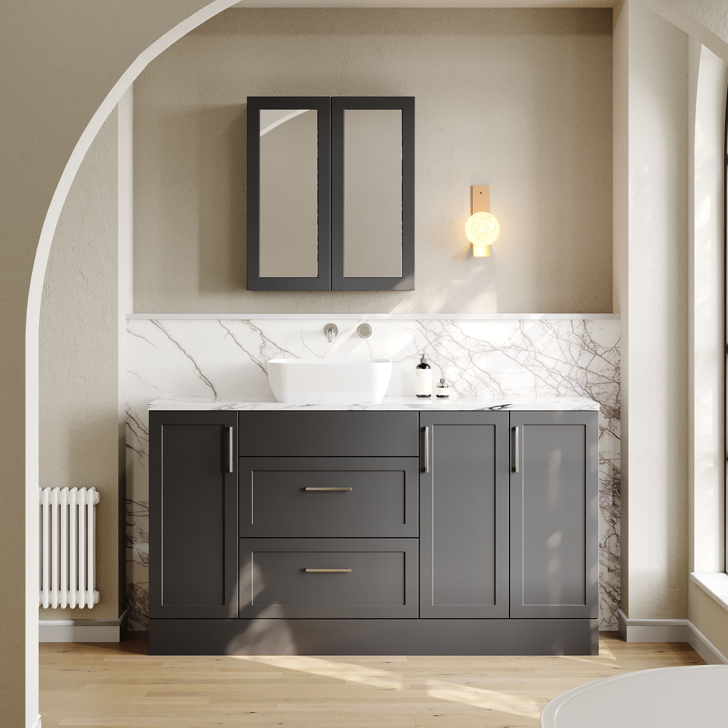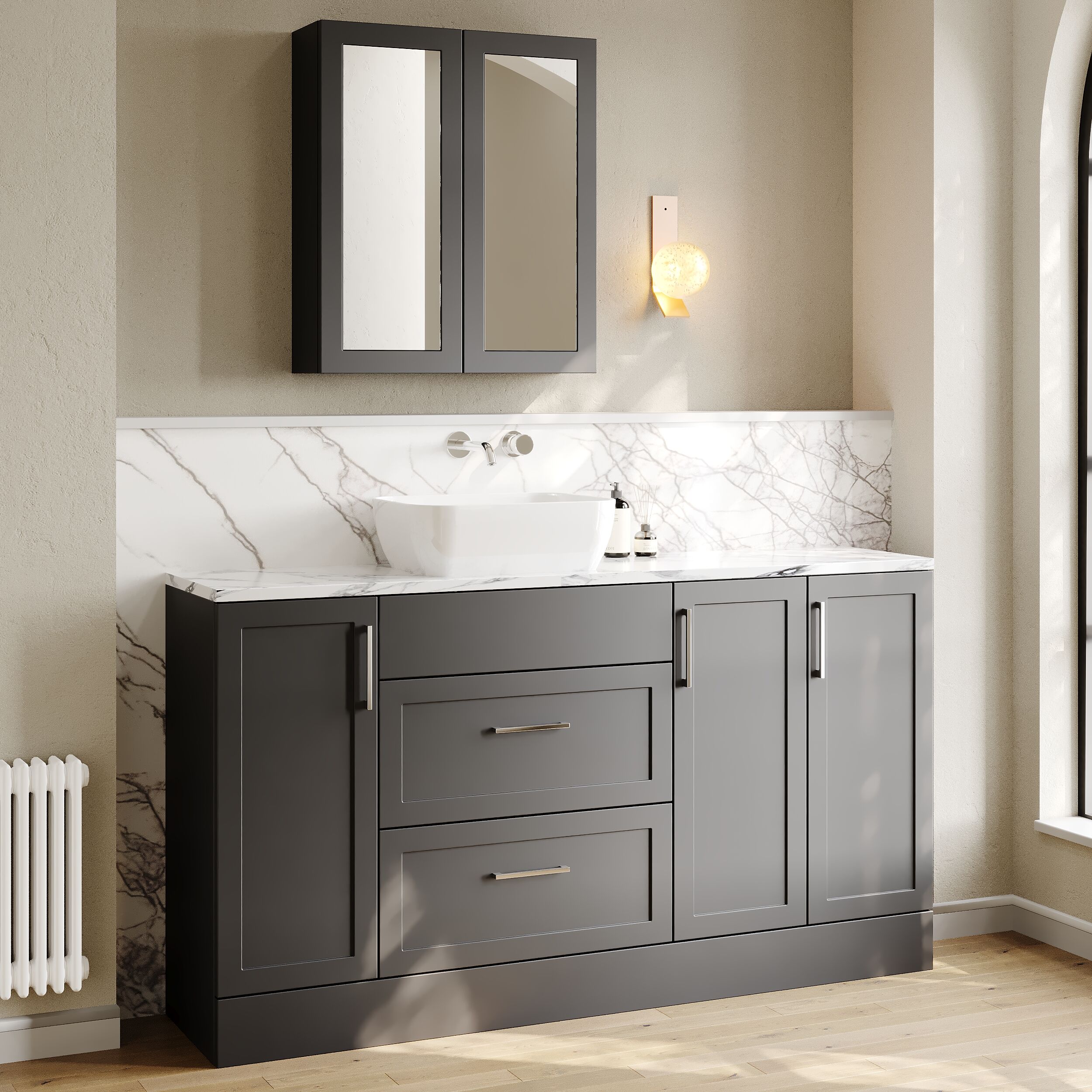 Supplied with a high quality laminate worktop and luxury vessel basin and handles.