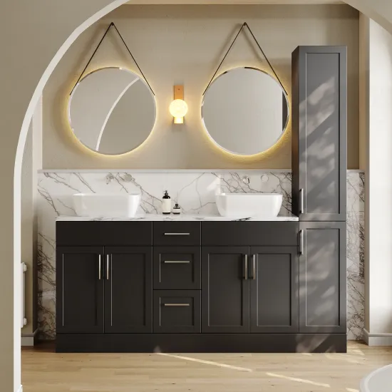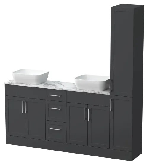 Supplied with a high quality laminate worktop and luxury vessel basin and handles.