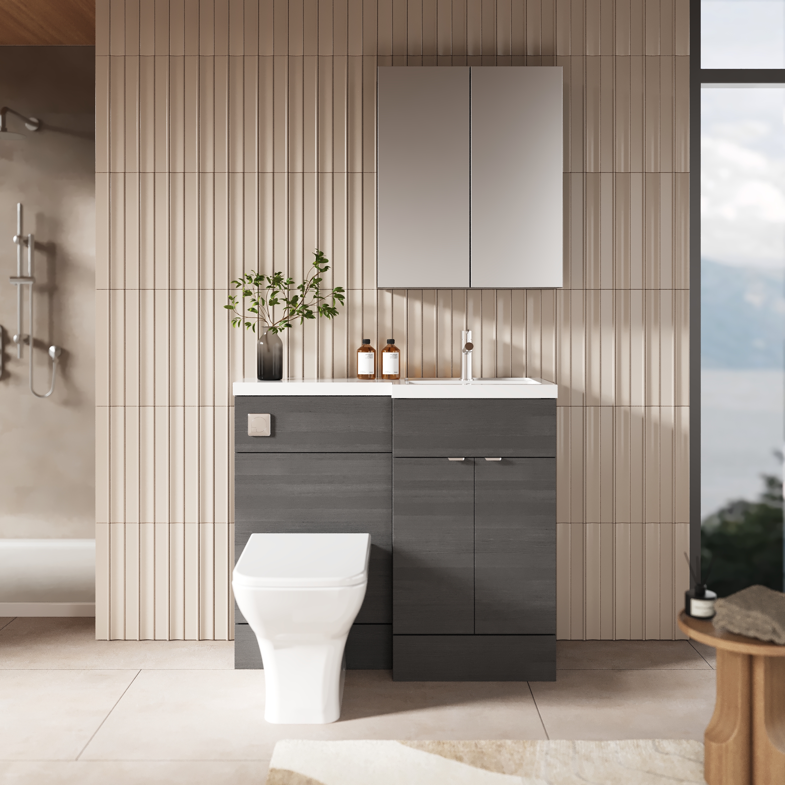 The unique combination of the Anthracite Woodgrain finish and natural wood grain creates a focal point in your bathroom