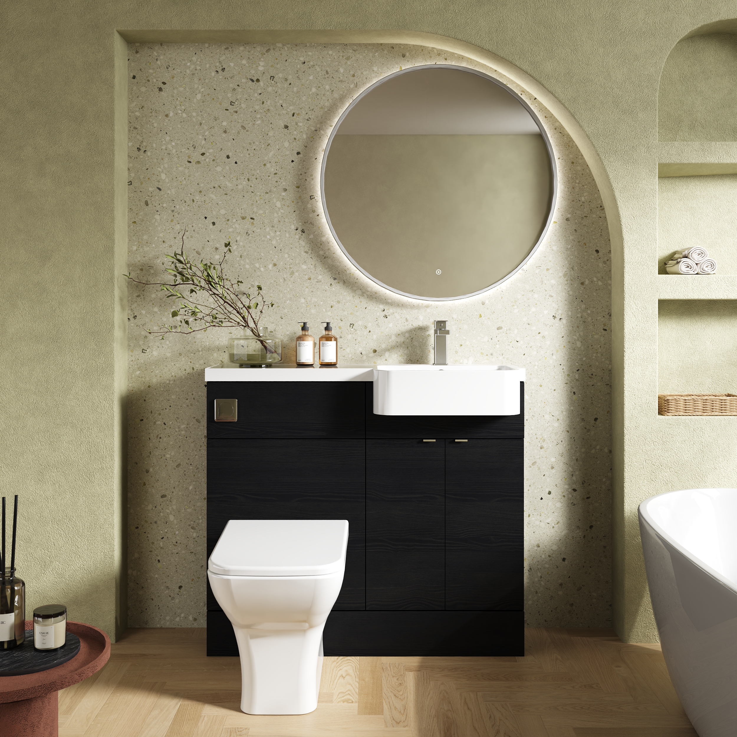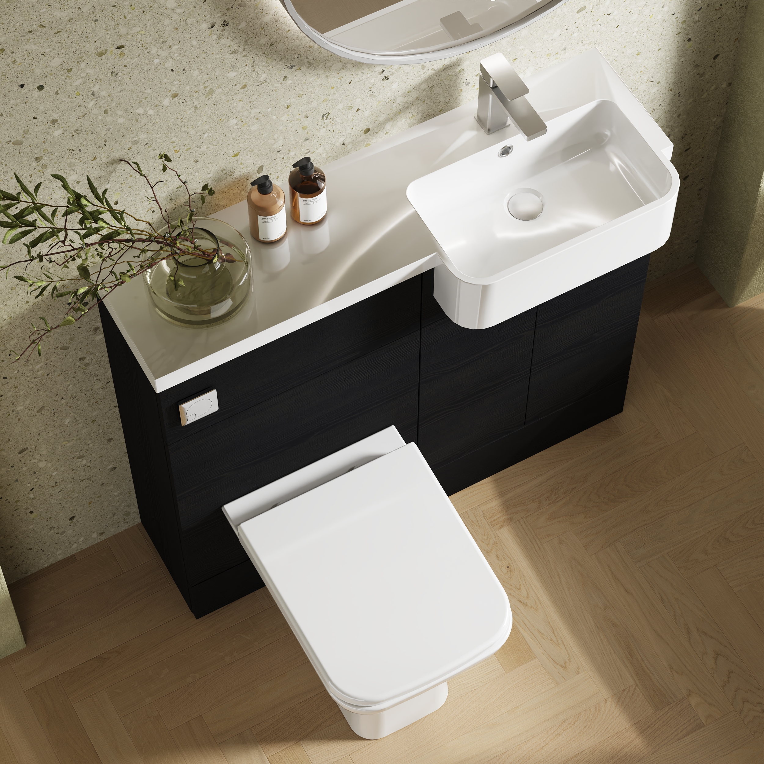 The striking finish of the Charcoal Black creates a warming effect to your bathroom