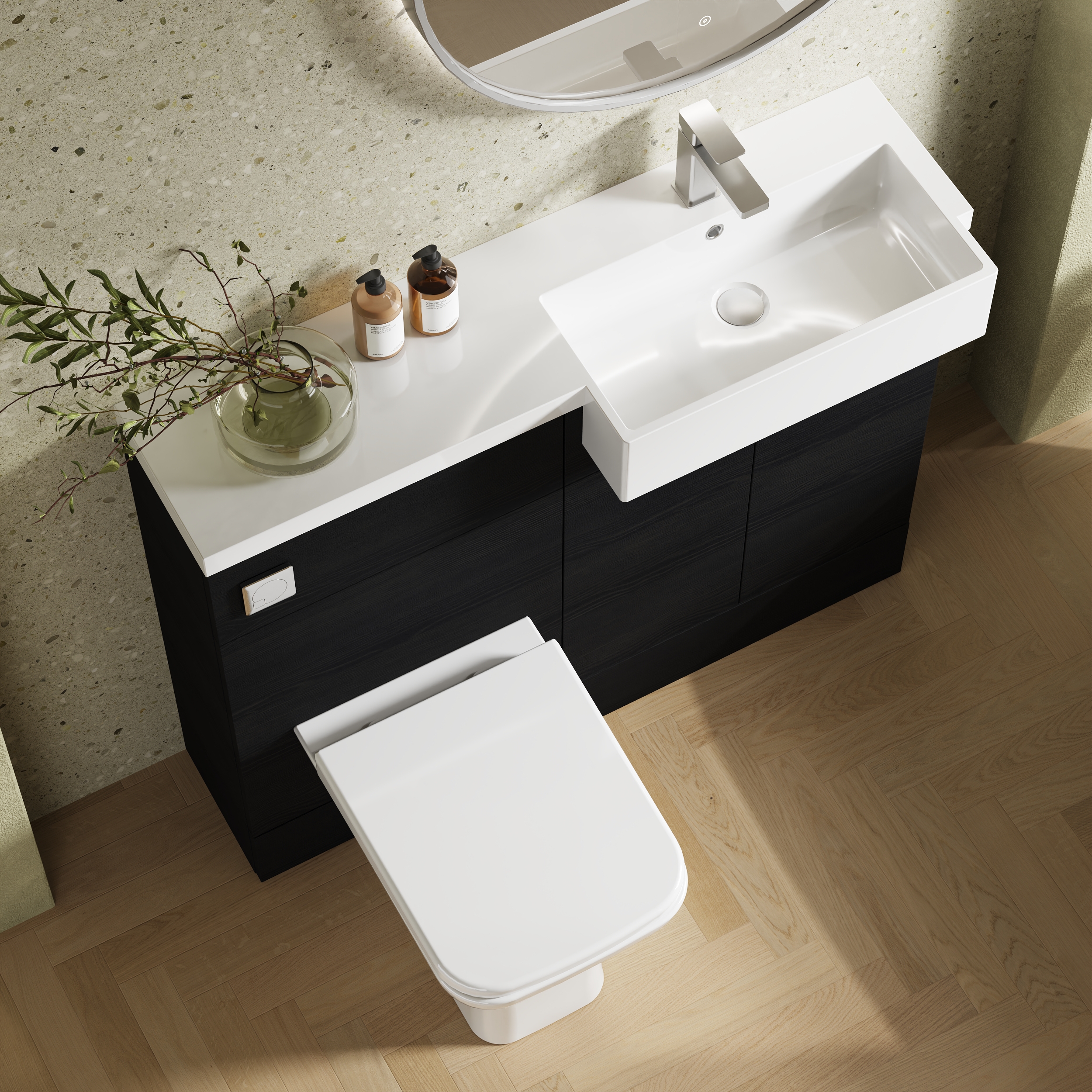 The striking finish of the Charcoal Black creates a warming effect to your bathroom