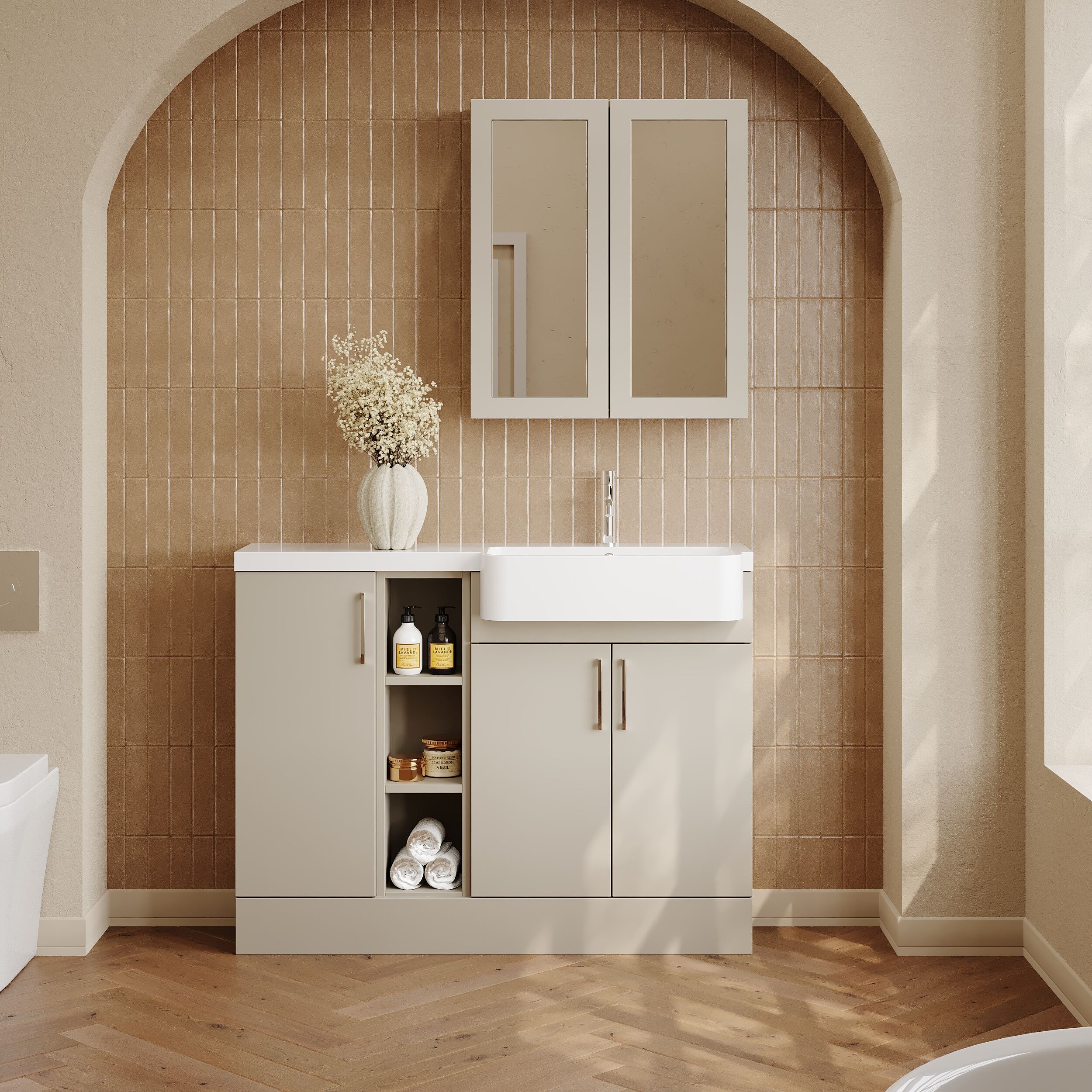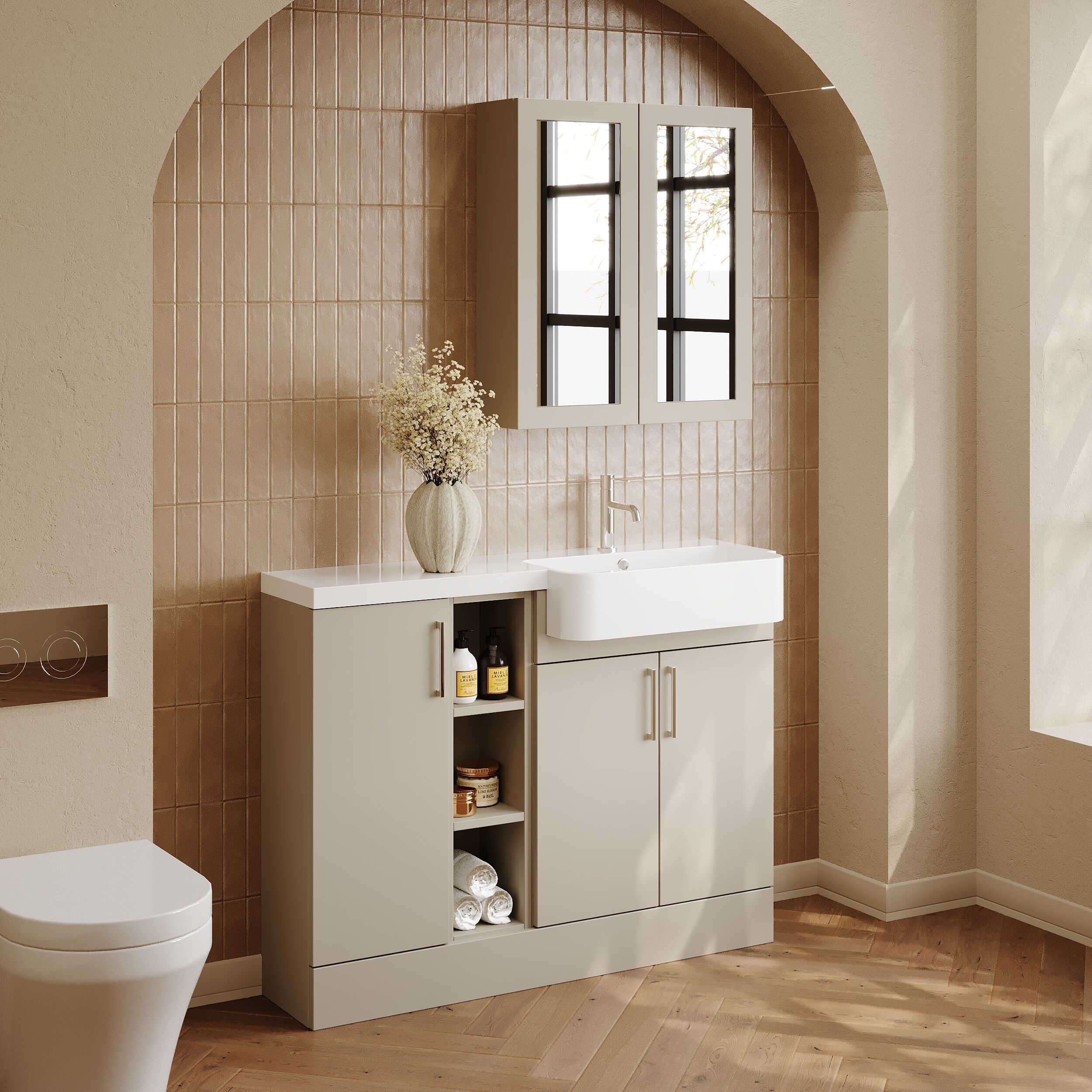 Nuie Lux Krest 1105mm Pebble Grey Right Hand Combination Unit & Basin With Soft Close Doors & Handles