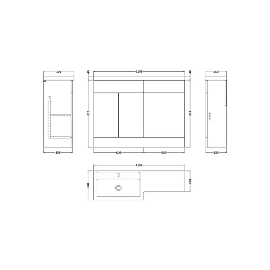 Nuie Lux Krest 1100mm Left Hand Combination Unit with L-Shaped Basin With Soft Close Doors & Drawers