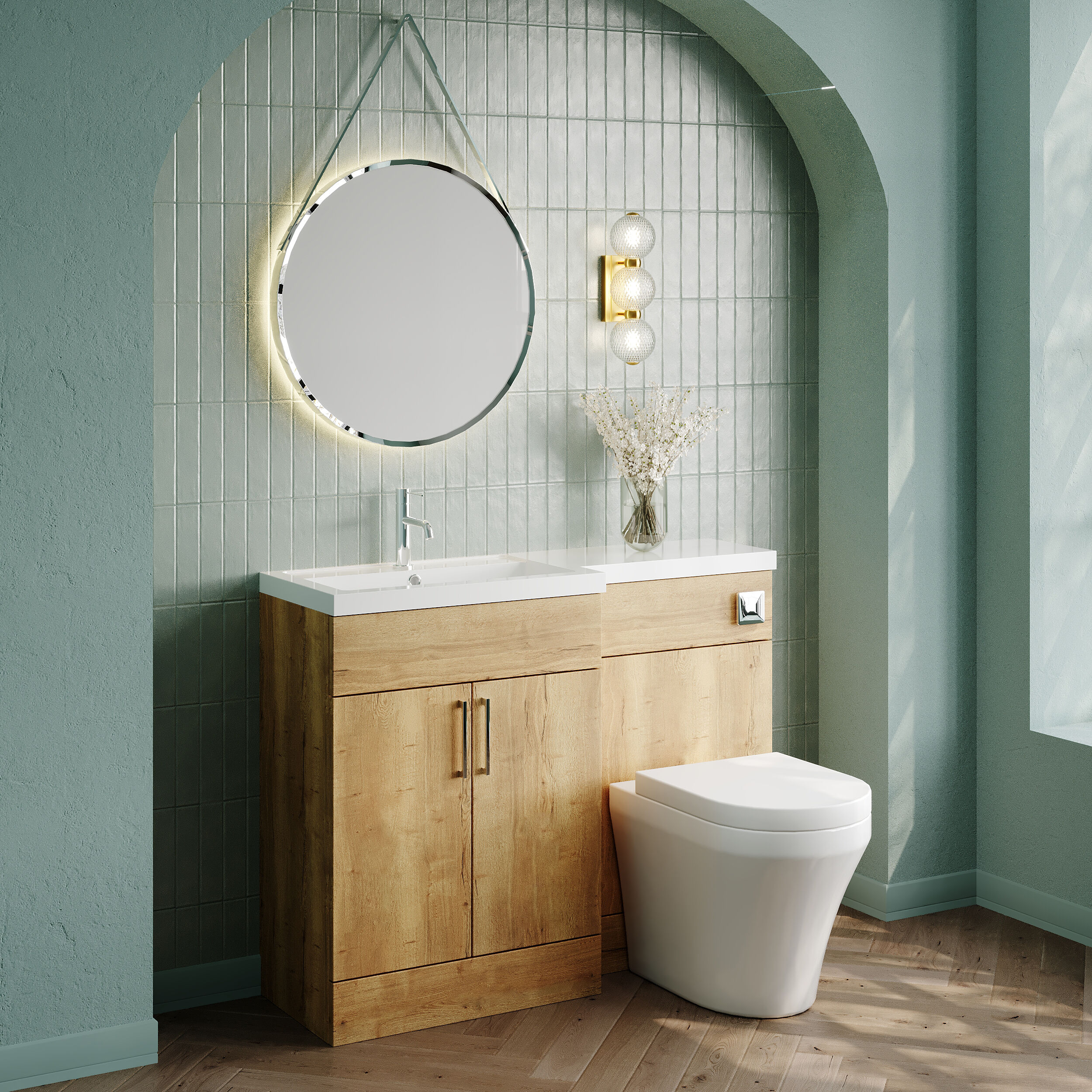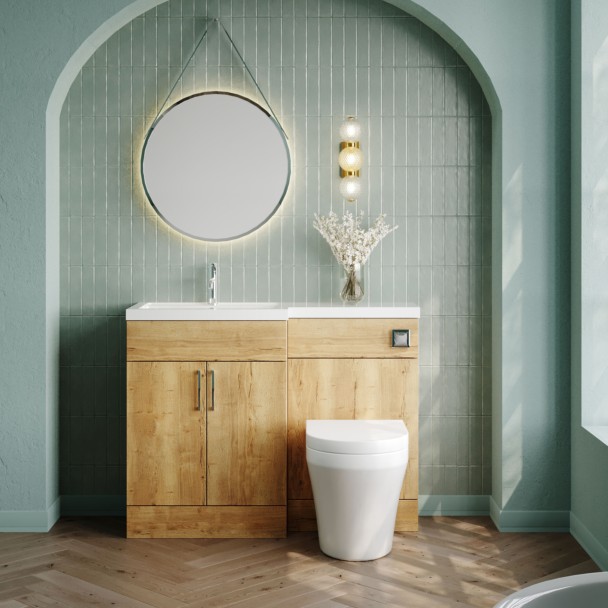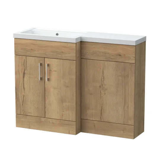 Nuie Lux Krest 1100mm Full Depth Combination Unit & L-Shaped Basin - Left Hand - Autumn Oak