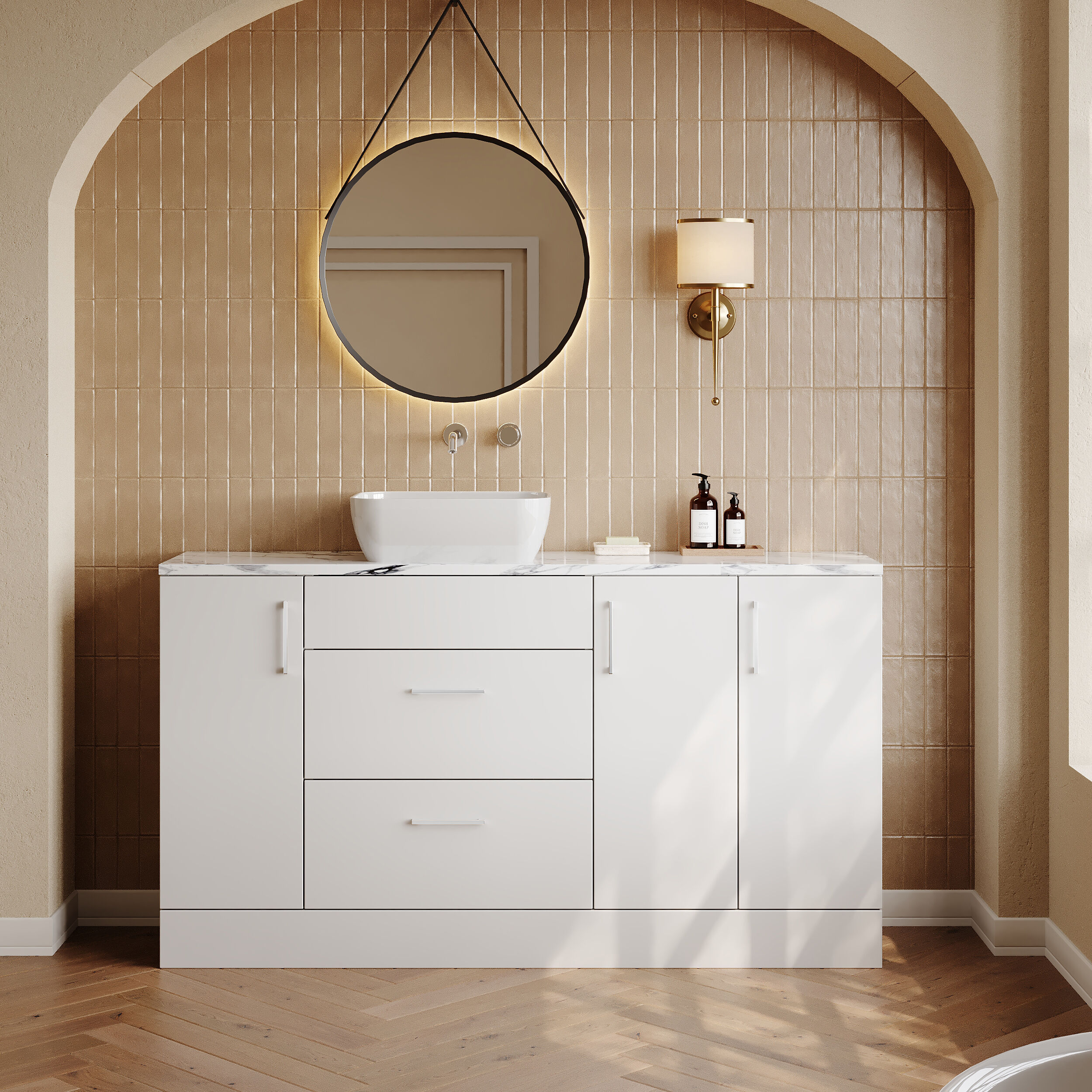 Supplied with a high quality laminate worktop and luxury vessel basin, as well as contemporary handles