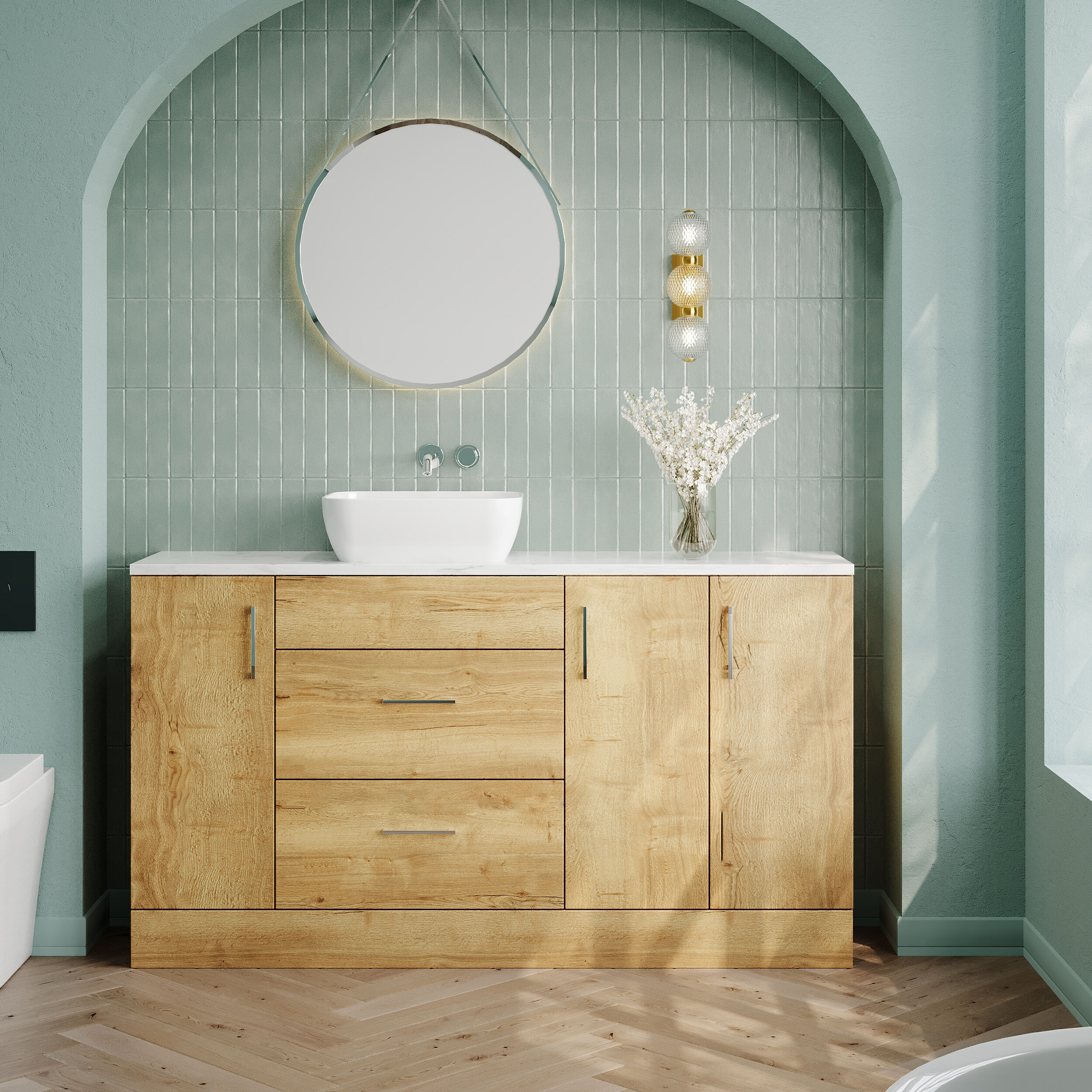 Supplied with a high quality laminate worktop and luxury vessel basin, as well as contemporary handles